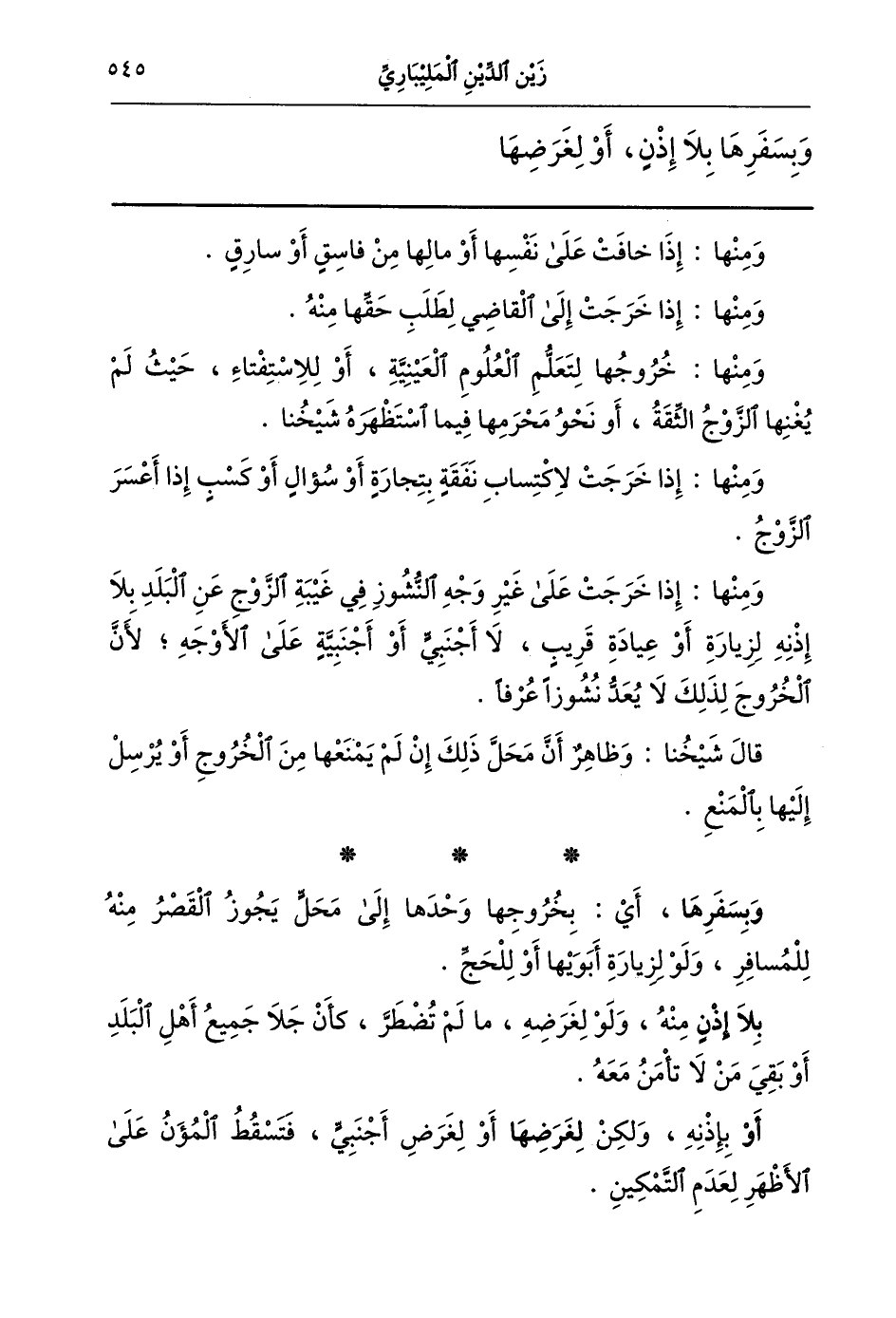 ومنها إذا خرجت على غير وجه النشوز في غيبة الزوج عن البلد بلا إذنه لزيارة أو عيادة قريب لا أجنبي أو أجنبية على الأوجه لان الخروج لذلك لا يعد نشوزا عرفا.