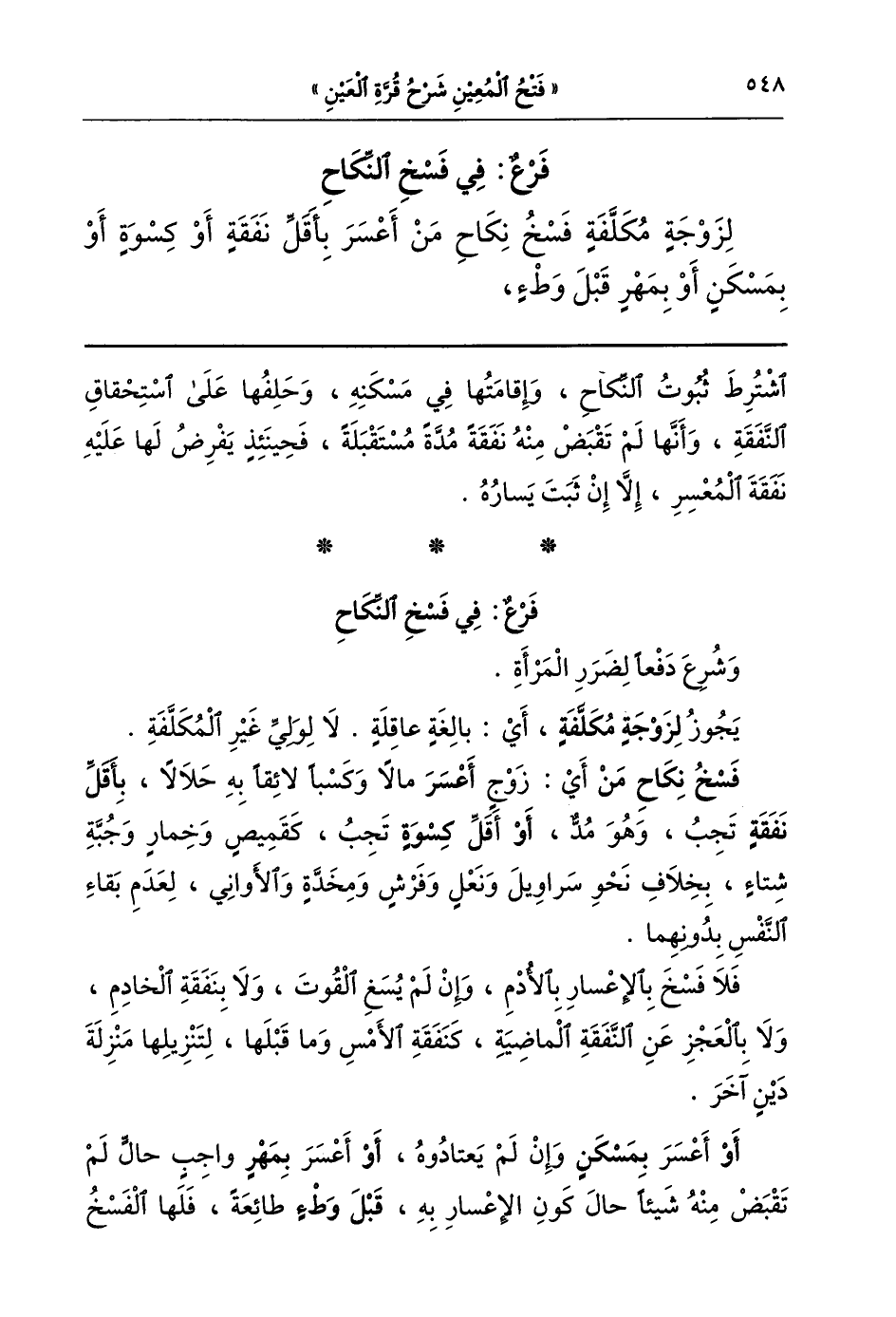 فسخ نكاح من أي زوج أعسر مالا وكسبا لائقا به حلالا بأقل نفقة تجب وهو مد أو أقل كسوة تجب كقميص وخمار وجبة شتاء بخلاف نحو سراويل ونعل وفرش ومخدة والأواني لعدم بقاء النفس بدونهما.