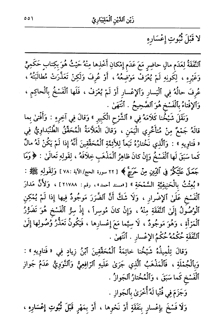 وقال العلامة المحقق الطنبداوي في فتاويه والذي نختاره تبعا للائمة المحققين أنه إذا لم يكن له مال كما سبق لها الفسخ وإن كان ظاهر المذهب خلافه لقوله تعالى: {وَمَا جَعَلَ عَلَيْكُمْ فِي الدِّينِ مِنْ حَرَجٍ} [22 سورة الحج الآية: 78] ولقوله صلى الله عليه وسلم: "بعثت بالحنيفية السمحة" [مسند أحمد رقم: 21788] ولان مدار الفسخ على الإضرار ولا شك أن الضرر موجود فيها إذا لم يمكن الوصول إلى النفقة منه وإن كان موسرا.