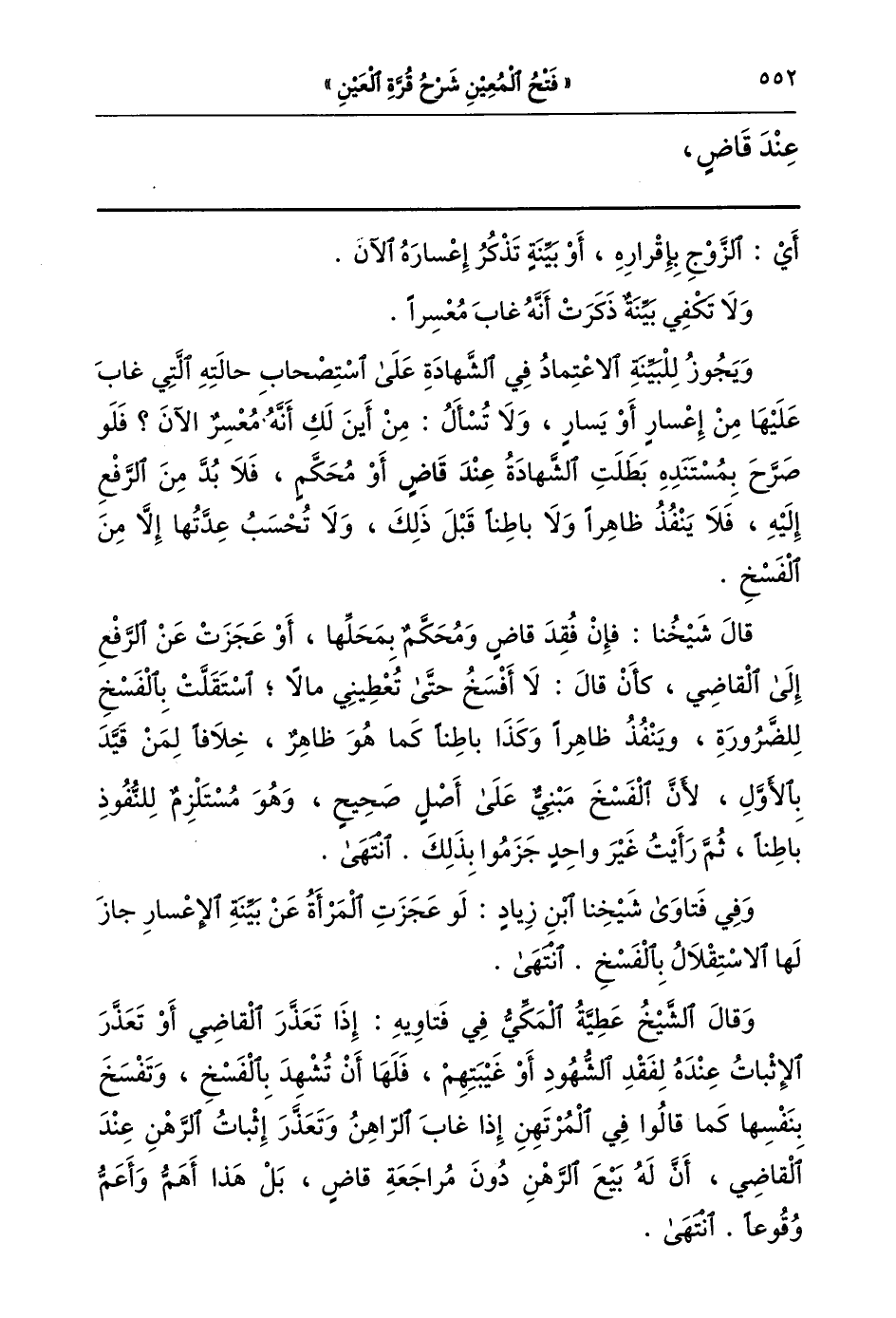 وقال الشيخ عطية المكي في فتاويه: إذا تعذر القاضي أو تعذر الإثبات عنده لفقد الشهود أو غيبتهم فلها أن تشهد بالفسخ وتفسخ بنفسها كما قالوا في المرتهن إذا غاب الراهن وتعذر إثبات الرهن عند القاضي أن له بيع الرهن دون مراجعة قاض بل هذا أهم وأهم وقوعا انتهى.
