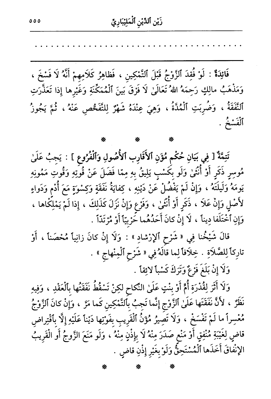 فائدة: لو فقد الزوج قبل التمكين فظاهر كلامهم أنه لا فسخ ومذهب مالك رحمه الله تعالى لا فرق بين
