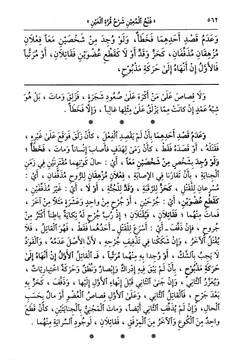 وعدم قصد أحدهما بأن لم يقصد الفعل كأن زلق فوقع على غيره فقتله أو قصده فقط كأن رمى لهدف فأصاب إنسانا ومات فخطأ ولو وجد بشخص من شخصين معا أي حال كونهما مقترنين في زمن الجناية بأن تقارنا في الإصابة فعلان مزهقان للروح مذففان أي مسرعان للقتل كحز للرقبة وقد للجثة أو لا أي غير مذففين كقطع عضوين أي جرحين أو جرح من واحد وعشرة مثلا من آخر فمات منهما فقاتلان فيقتلان: إذ رب جرح له نكاية باطنا أكثر من جروح فإن ذفف أي أسرع للقتل أحدهما فقط فهو القاتل فلا يقتل الآخر وإن شككنا في تذفيف جرحه لان الأصل عدمه والقود لا يجب بالشك أو وجدا به منهما مرتبا ف القاتل الأول إن أنهاه إلى حركة مذبوح بأن لم يبق فيه إدراك وإبصار ونطق وحركة اختياريات ويعزر الثاني وإن جنى الثاني قبل إنهاء الأول إليها وذفف كحز به بعد جرح فالقاتل الثاني وعلى الأول قصاص العضو أو مال بحسب الحال وإن لم يذفف الثاني أيضا ومات المجني بالجنايتين كأن قطع واحد من الكوع والآخر من المرفق فقاتلان لوجود السراية منهما.