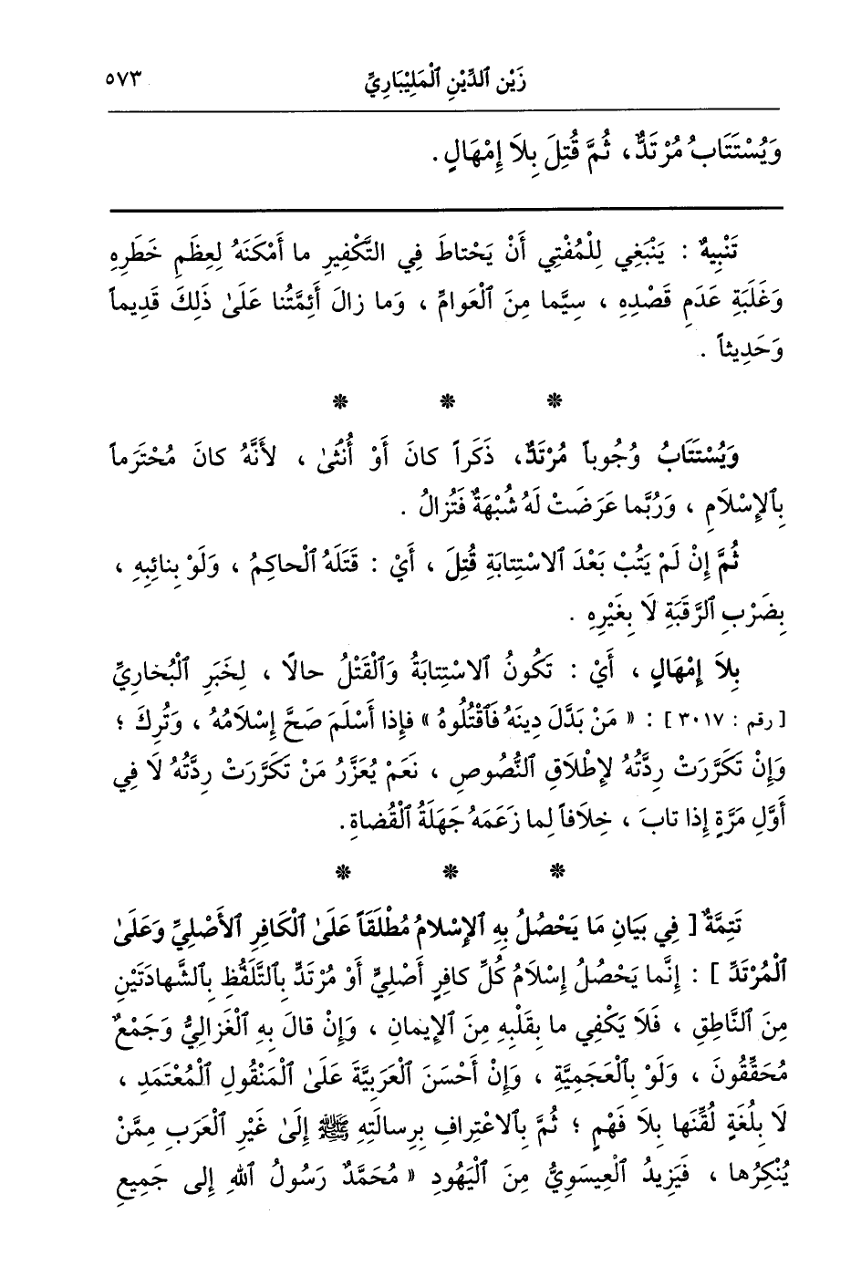 ويستتاب وجوبا مرتد ذكرا كان أو أنثى لأنه كان محترما بالإسلام وربما عرضت له شبهة فتزال.