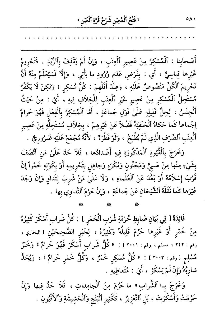 أصحابنا المسكر من عصير العنب وإن لم يقذف بالزبد فتحريم غيرها قياسي: أي بفرض عدم ورود ما يأتي وإلا فسيعلم منه أن تحريم الكل منصوص عليه وعند أقلهم كل مسكر ولكن لا يكفر مستحل المسكر من عصير غير العنب للخلاف فيه أي من حيث الجنس لحل قليله على قول جماعة أما المسكر بالفعل فهو حرام إجماعا كما حكاه الحنفية فضلا عن غيرهم بخلاف مستحله من عصير العنب الصرف الذي لم يطبخ ولو قطرة لأنه مجمع عليه ضروري.