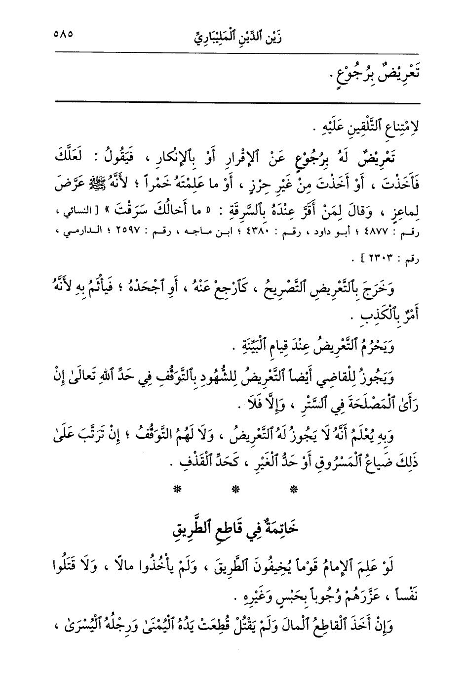 تعريض له برجوع عن الإقرار أو بالإنكار فيقول لعلك فأخذت أو أخذت من غير حرز أو ما علمته خمرا لأنه ص عرض لماعز وقال لمن أقر عنده بالسرقة ما أخالك سرقت [النسائي رقم: 4877, أبو داود رقم: 4380, ابن ماجه رقم: 2597, الدارمي رقم: 2303] .