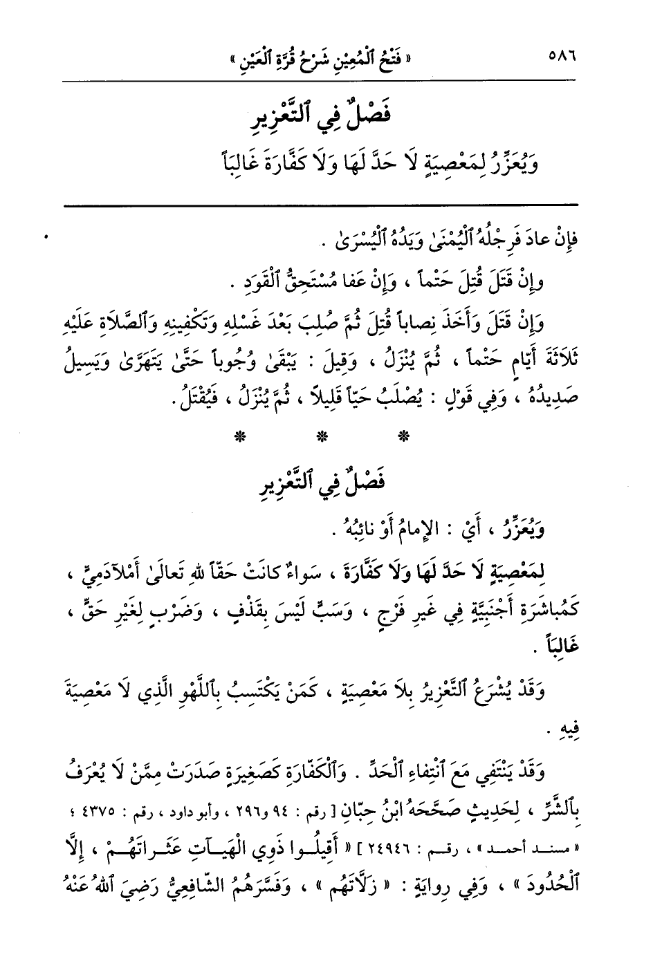 ويعزر أي الإمام أو نائبه لمعصية لا حد لها ولا كفارة سواء كانت حقا لله تعالى أم لآدمي كمباشرة أجنبية في غير فرج وست ليس بقذف وضرب لغير حق غالبا.