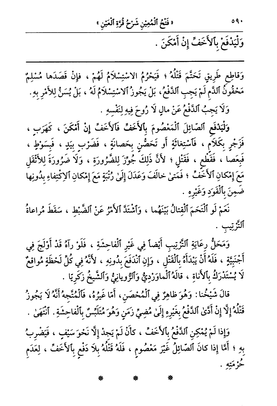 ومحل رعاية الترتيب أيضا في غير الفاحشة فلو رآه قد أولج في أجنبية فله أن يبدأه بالقتل وإن اندفع بدونه لأنه في كل لحظة مواقع لا يستدرك بالأناة قاله الماوردي والروياني والشيخ زكريا.