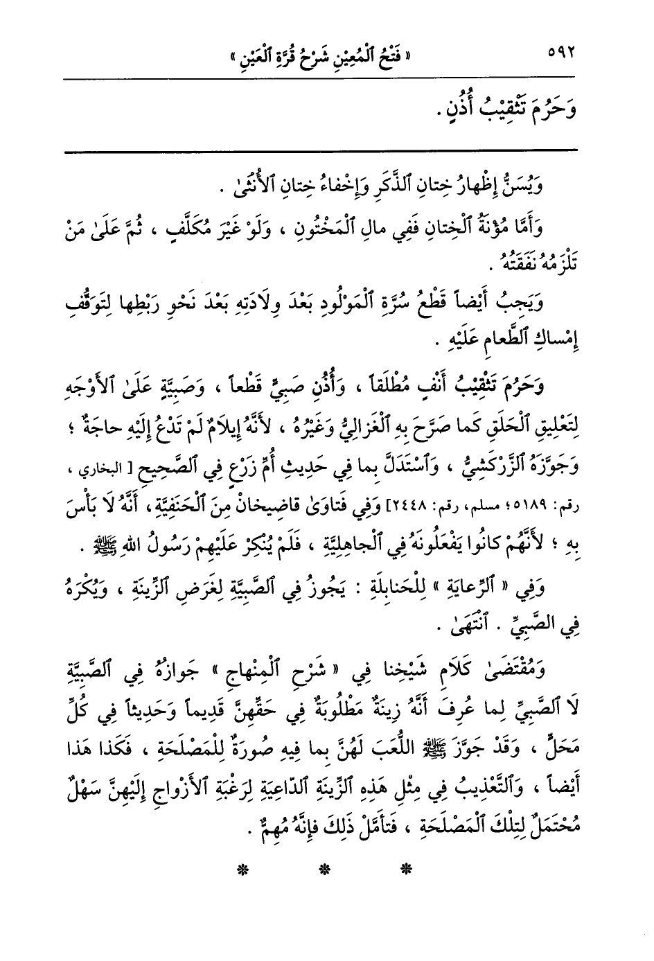 ومقتضى كلام شيخنا في شرح المنهاج جوازه في الصبية لا الصبي لما عرف أنه زينة مطلوبة في حقهن قديما وحديثا في كل محل وقد جوز ص اللعب لهن بما فيه صورة للمصلحة فكذا هذا أيضا والتعذيب في مثل هذه الزينة الداعية لرغبة الأزواج إليهن سهل محتمل ومغتفر لتلك المصلحة فتأمل ذلك فإنه مهم.