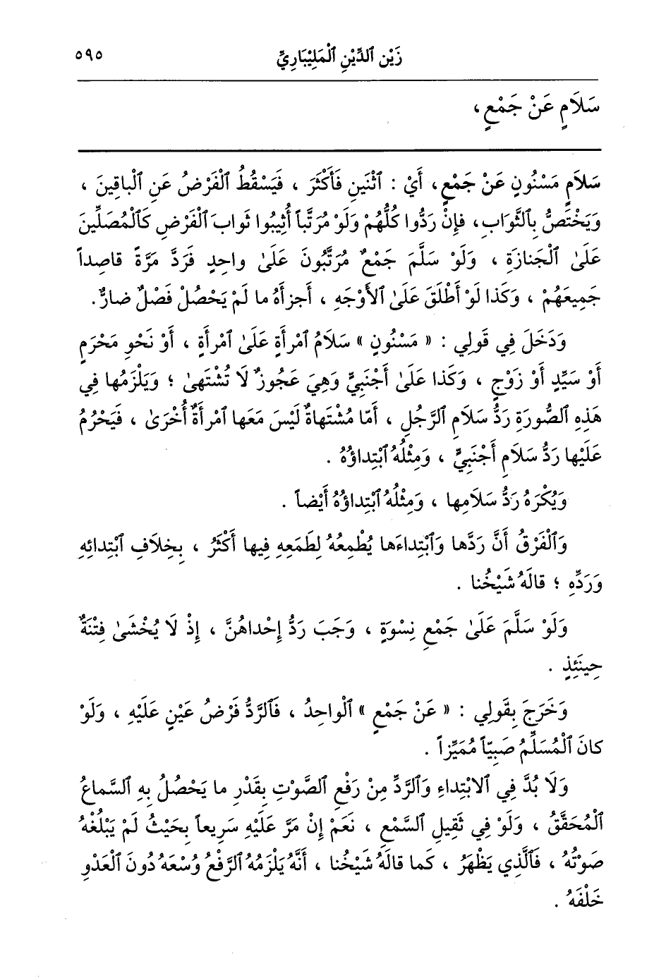 سلام مسنون عن جمع أي اثنين فأكثر فيسقط الفرض عن الباقين ويختص بالثواب فإن ردوا كلهم ولو مرتبا أثيبوا ثواب الفرض كالمصلين على الجنازة ولو سلم جمع مرتبون على واحد فرد مرة قاصدا جميعهم وكذا لو أطلق على الأوجه أجزأه ما لم يحصل فصل ضار.