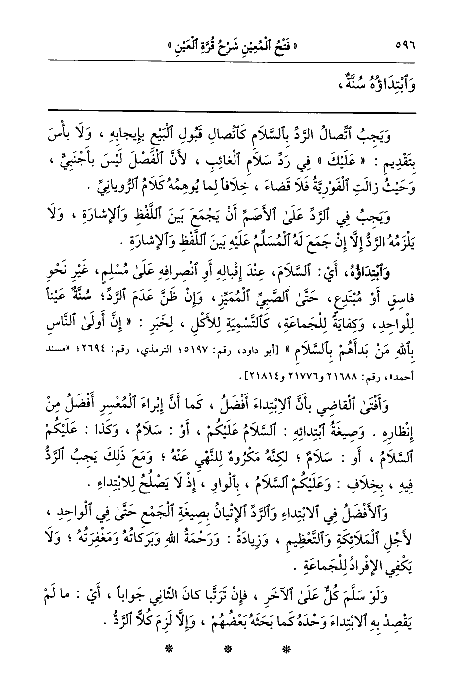 وابتداؤه أي السلام عند إقباله أو انصرافه على مسلم غير نحو فاسق أو مبتدع حتى الصبي المميز وإن ظن عدم الرد سنة عينا للواحد وكفاية للجماعة كالتسمية للأكل لخبر: "أن أولى الناس بالله من بدأهم بالسلام". [أبو داود رقم: 5197, الترمذي رقم: 2694, مسند أحمد رقم: 21688, 21776, 21814] .