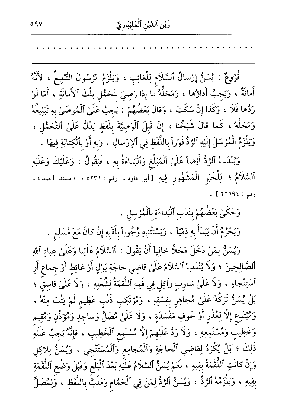 فروع: يسن إرسال السلام للغائب ويلزم الرسول التبليغ لأنه أمانة ويجب أداؤها ومحله ما إذا رضي بتحمل تلك الأمانة أما لو ردها فلا وكذا إن سكت وقال بعضهم: يجب على الموصى به تبليغه ومحله كما قال شيخنا إن قبل الوصية بلفظ يدل على التحمل ويلزم المرسل إليه الرد فورا باللفظ في الإرسال وبه أو بالكتابة فيها.