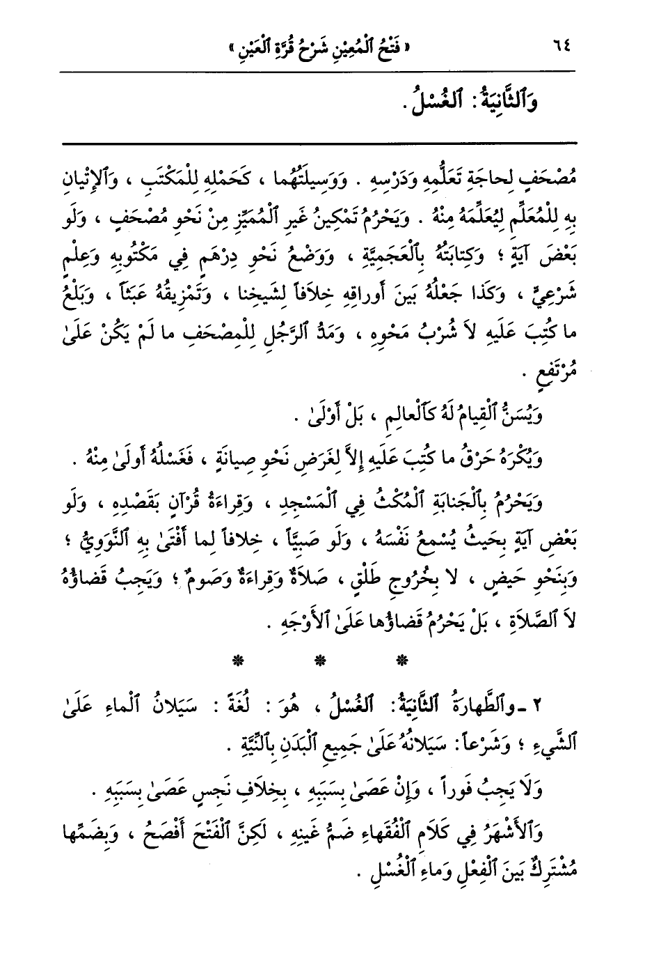 2- والطهارة الثانية: الغسل هو لغة: سيلان الماء على الشيء وشرعا: سيلانه على جميع البدن بالنية.