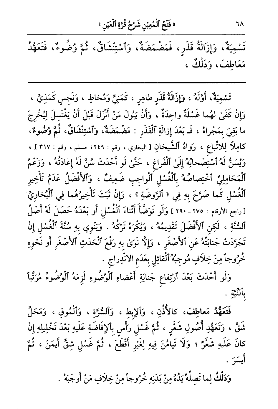 تسمية أوله وإزالة قذر طاهر كمني ومخاط ونجس كمذي وإن كفى لهما غسلة واحدة وأن يبول من أنزل قبل أن يغتسل ليخرج ما بقي بمجراه ف بعد إزالة القذر مضمضة واستنشاق ثم وضوء كاملا للاتباع رواه الشيخان. [البخاري رقم: 249, ومسلم رقم: 317] ويسن له استصحابه إلى الفراغ حتى لو أحدث سن له إعادته وزعم المحاملي اختصاصه بالغسل الواجب ضعيف والأفضل عدم تأخير غسل قدميه عن الغسل كما صرح به في الروضة وإن ثبت تأخيرهما في البخاري ولو توضأ أثناء الغسل أو بعده حصل له أصل السنة لكن الأفضل تقديمه ويكره تركه وينوي به سنة الغسل إن تجردت جنابته عن الأصغر وإلا نوى به رفع الحدث الأصغر أو نحوه خروجا من خلاف موجبه القائل بعدم الاندراج.