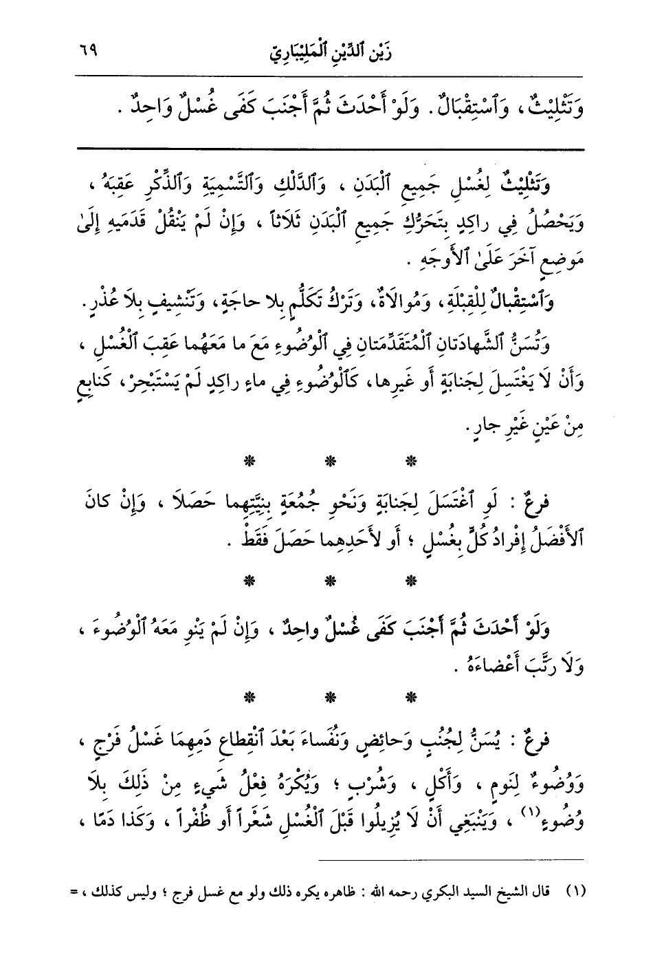 وتثليث لغسل جميع البدن والدلك والتسمية والذكر عقبه ويحصل في راكد بتحرك جميع البدن ثلاثا وإن لم ينقل قدميه إلى موضع آخر على الأوجه.