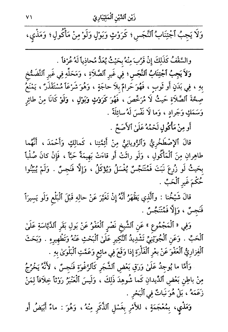ولا يجب اجتناب النجس في غير الصلاة ومحله في غير التضمخ به في بدن أو ثوب فهو حرام بلا حاجة وهو شرعا مستقذر يمنع صحة الصلاة حيث لا مرخص فهو كروث وبول ولو كانا من طائر وسمك وجراد وما لا نفس له سائلة.