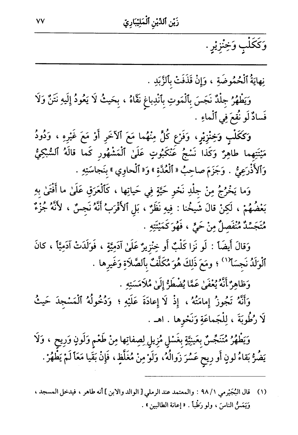 1 قال البجيرمي 1/98 والمعتمد عند الرملي [الوالد والابن] أنه طاهر فيدخل المسجد ويمس الناس ولو رطبا إعانة الطالبين.