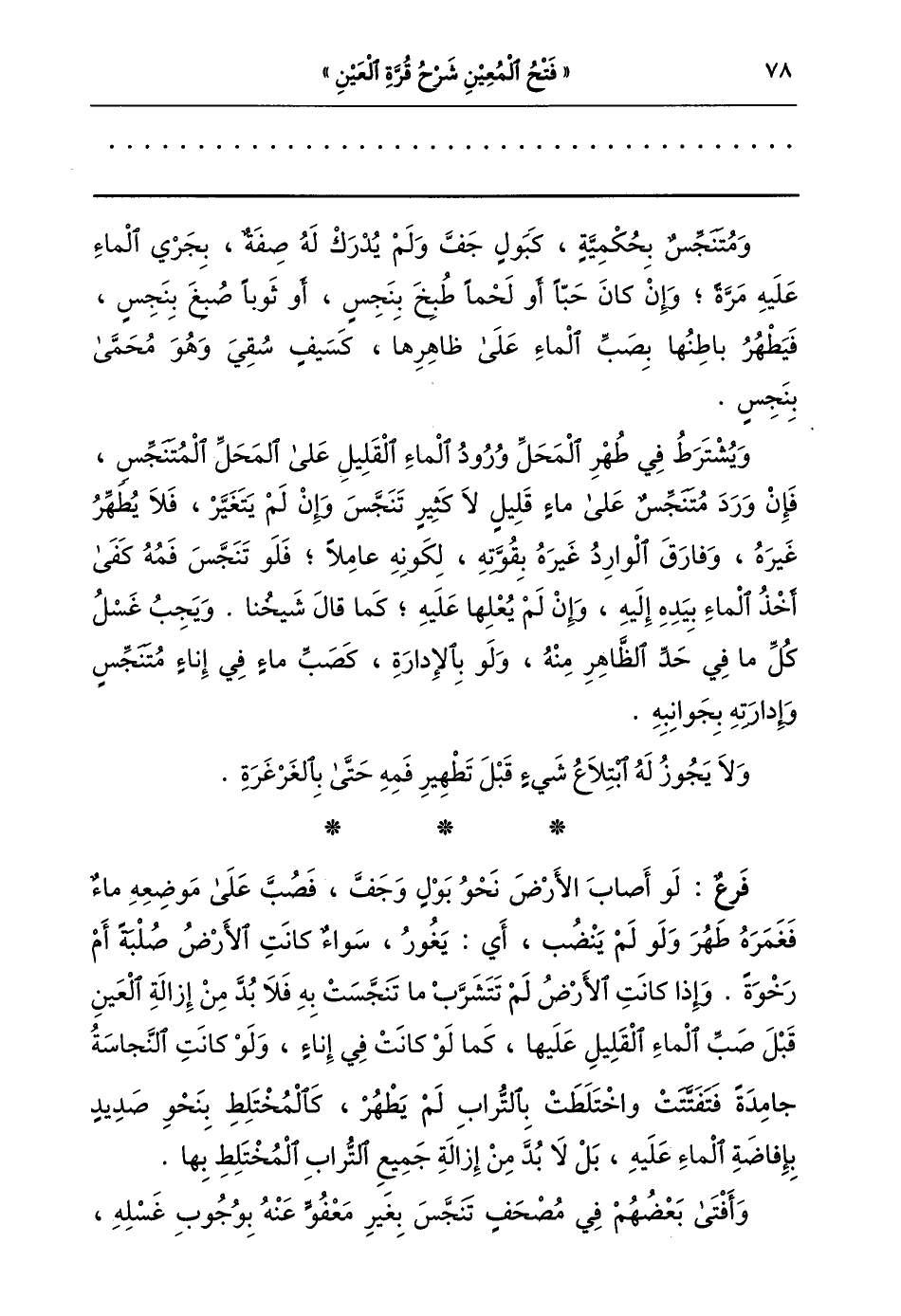 فرع لو أصاب الأرض نحو بول وجف فصب على موضعه ماء فغمره طهر ولو لم ينضب أي يغور سواء كانت الأرض صلبة أم رخوة وإذا كانت الأرض لم تتشرب ما تنجست به فلا بد من إزالة العين قبل صب الماء القليل عليها كما لو كانت في إناء ولو كانت النجاسة جامدة فتفتتت واختلطت بالتراب لم يطهر