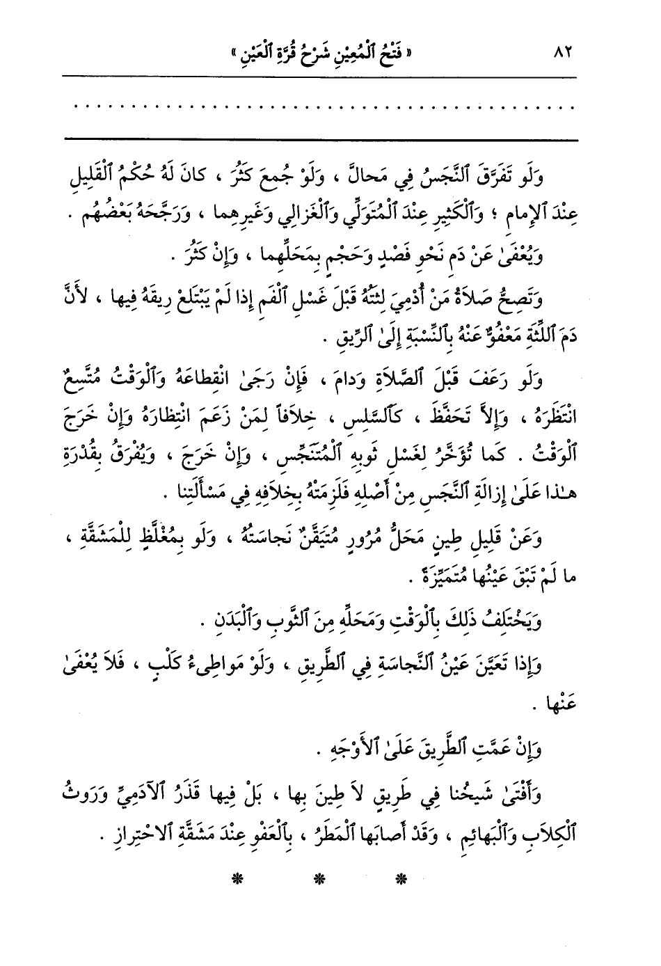 وأفتى شيخنا في طريق لا طين بها بل فيها قذر الآدمي وروث الكلاب والبهائم وقد أصابها المطر بالعفو عند مشقة الاحتراز.