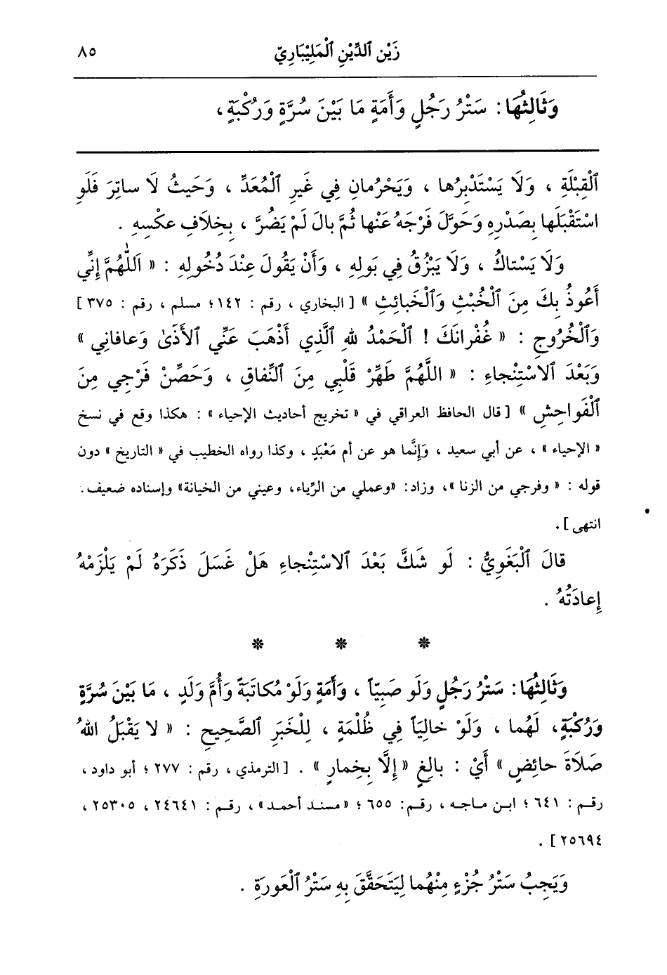 ثالثها: أي شروط الصلاة ستر رجل ولو صبيا وأمة ولو مكاتبة وأم ولد ما بين سرة وركبة لهما ولو خاليا في ظلمة للخبر الصحيح: لا يقبل الله صلاة حائض أي بالغ إلا بخمار. [الترمذي رقم: 277, أبو داود رقم: 641, ابن ماجه رقم: 655, مسند أحمد رقم: 24641, 25305, 25694] .