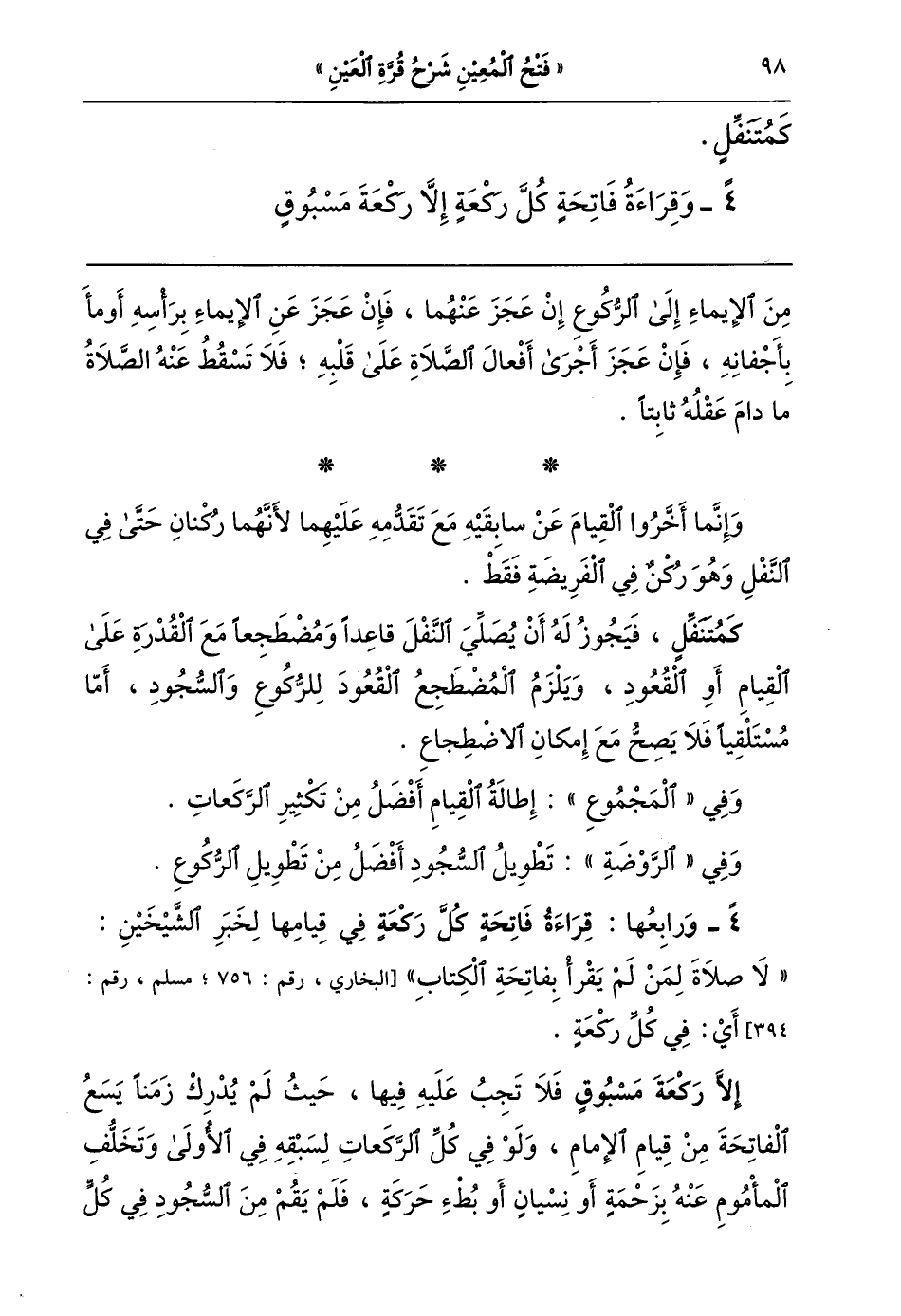 4- وقراءة فاتحة كل ركعة إلا ركعة مسبوق