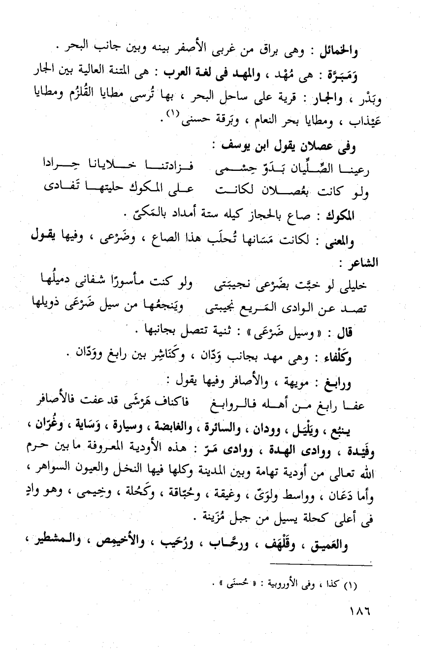 ينبُع. ويَلْيل وودان والسائر والغايضة وسيارة وَسَاية وغُرّان وفَيدة ووادي الهده ورادي مَرّ. هذه الأودية معروفة ما بين الحرم الله تعالى من أودية تهامة وبين المدينة وكلها فيها النخل والعيو السواهر، واما دعان وواسط وكوىّ وغلقة وحبّاقة وكَحلة وهو واد في أعلى كحلة يسيل من جبال مزينة. والعميق وقلهف ورحّاب ورُحَيب والاخيمص والمشطير