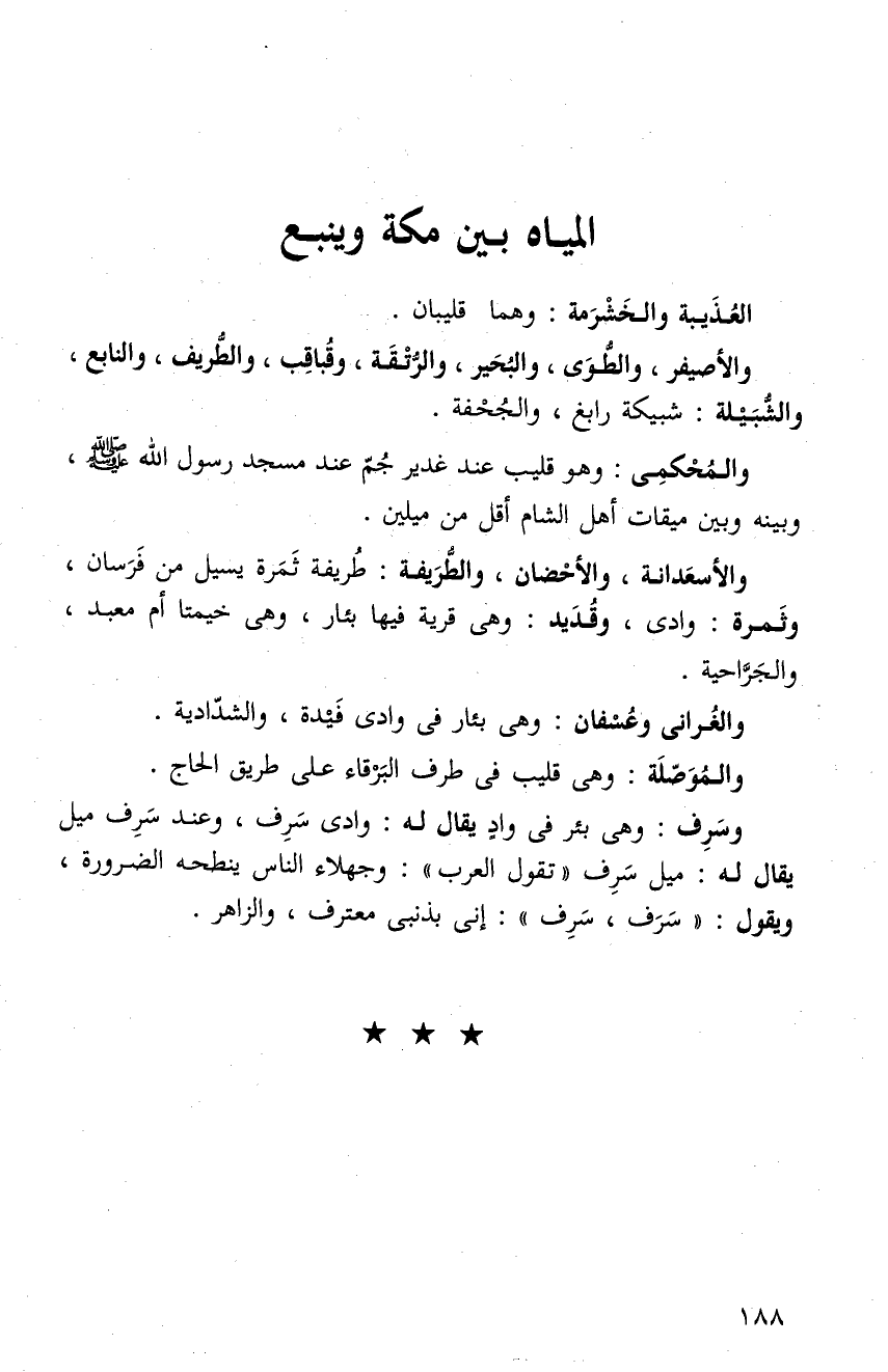 العُذيبة والالخشرمة رهمان قلبيان. والأصيفر. والطُوي والبُحير. والرتقة وقُباقب. والطُريف. والنابع. والشُبَيكة شُبيكة رابغ. والجحفة. والمُحكَّمى وهو قليب عند غدير خُمّ عند مسجد رسول الله " ص " وبينه وبين ميقات أهل الشام أقل من ميلين. والأسعدانة والأحضان. والطُريفة طُريفة ثمرة من فَرَسان وثمود واد، وقُدَيد وهي قرية فيها بئار وهي خيمتا أم معبد، والجَّراحية. والغُراني وعُسفان وهي بئار في وادي فيدة، والشِدّادية والمُوصلة وهي ركبة في طرف البرقاء على طريق الحاج. وسرِف وهي بئار في وادي يقال له وادي سَرِف وعند سرف ميل يقال له ميل سرف يقول العرب: وجهلاء الناس ينطحه الضرورة، ويقول "سَرَف، سَرِف" اني بذنبي معترف والزاهر.