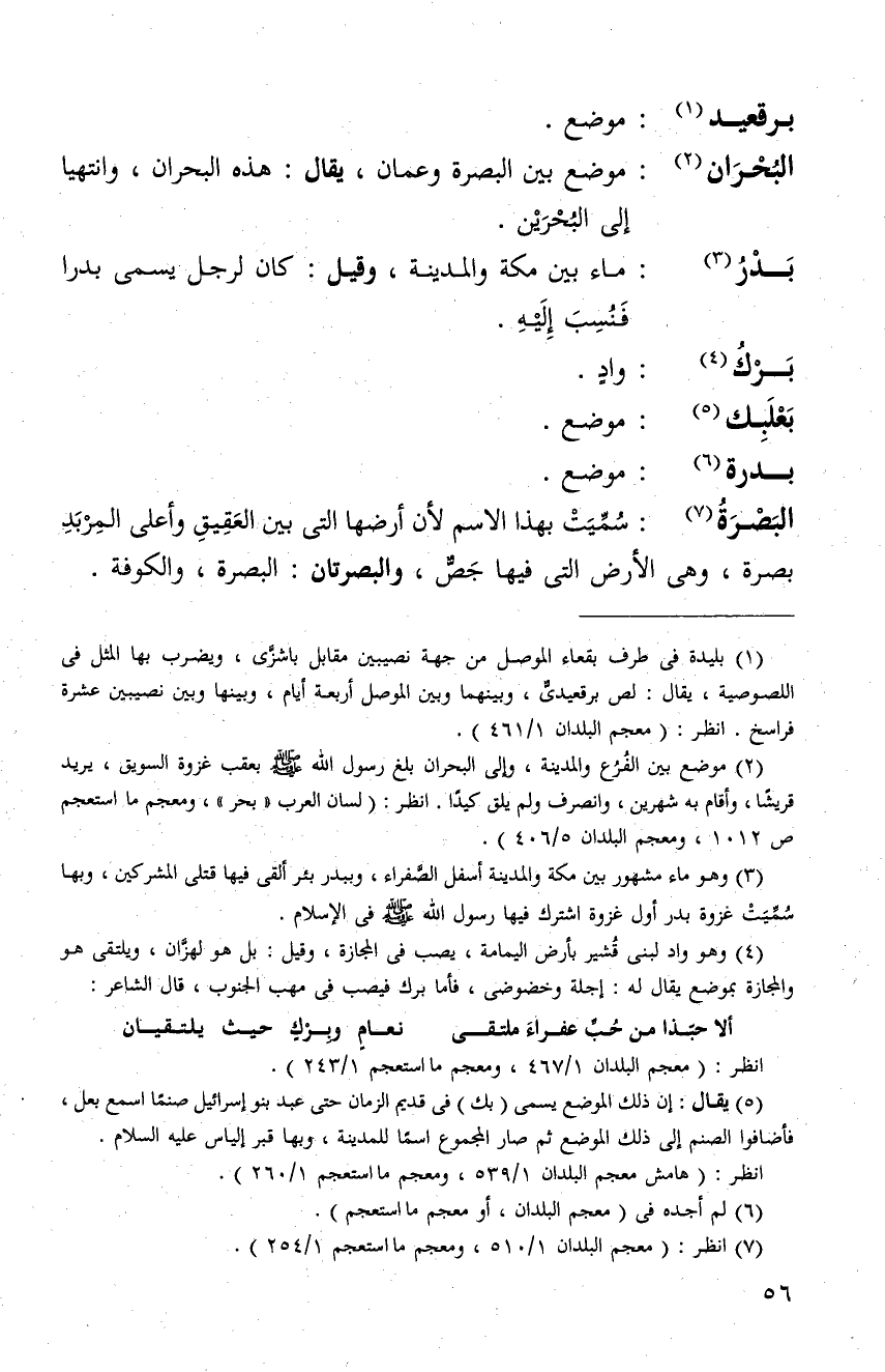 البحران: موضع بين البصرة وعمان، يقال. هذه البحران، وانتهينا الى البحرين بدر: ماء بين مكة والمدينة، وقيل: كان لرجل يسمى بدراً فنسب اليه.
