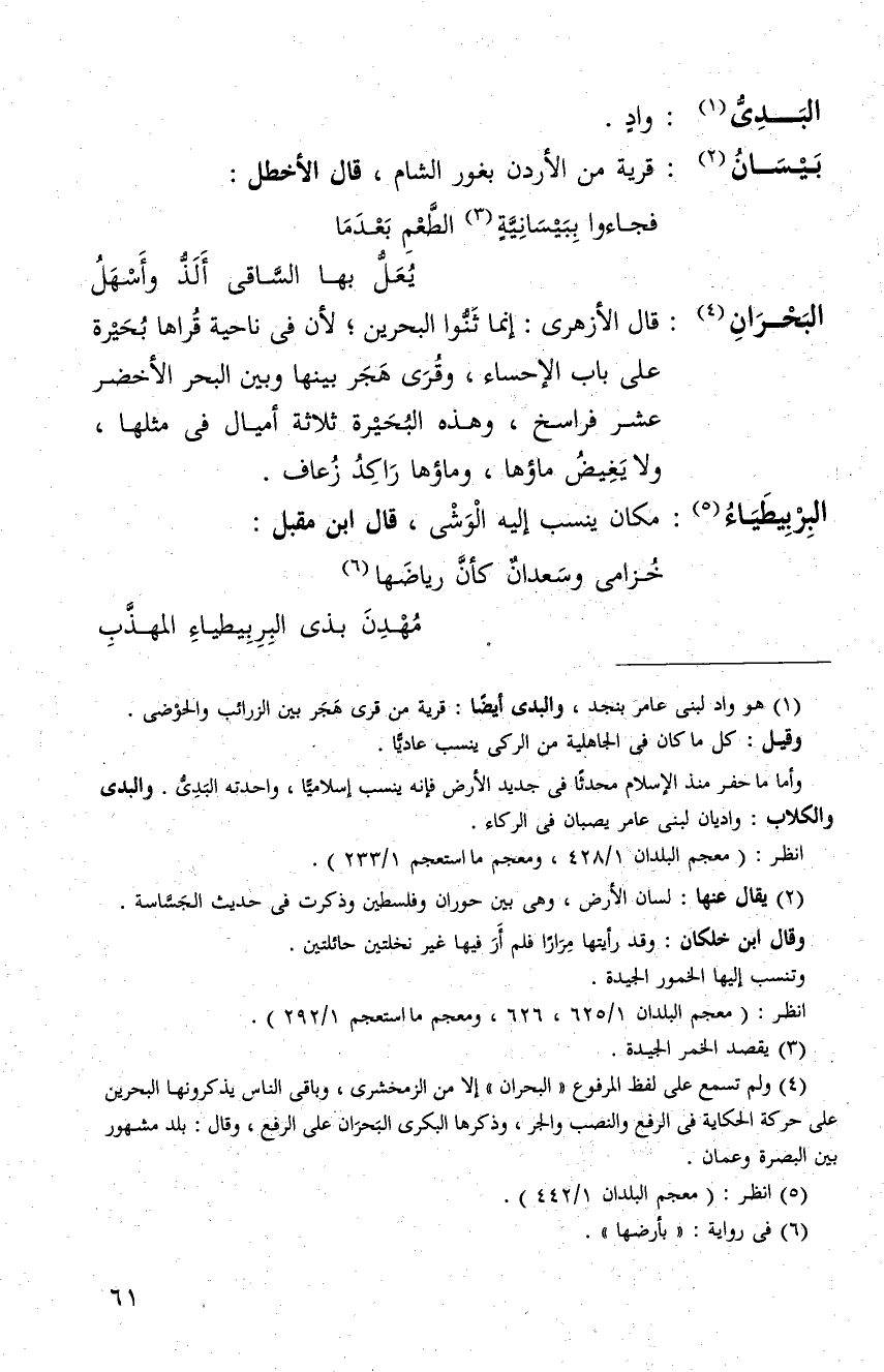 البحران: قال الأزهري انما ثنوا البحرين لان في ناحية قراها بحيرة على باب الأحساء، وقرى هَجَر بينها وبين البحر الأخضر عشرة فراسخ وهذه البحيرة ثلاثة أميال في مثلها، ولا يغيض ماؤها، وماؤها راكد زعاف.