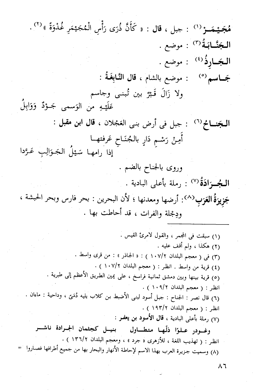 جزيرة العرب: أرضها ومعدنها لان البحرين بحر فارس وبحر الحبشة، ودجلة والفرات، قد أحاطت بها.