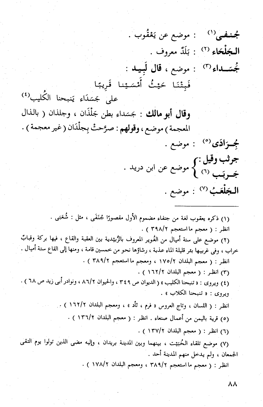 وقال ابو مالك: جسداء بطن جلذان، وجلذان " بالذال المعجمة " موضع، وقولهم: صرًَحت بجلدان " غير معجمة ".