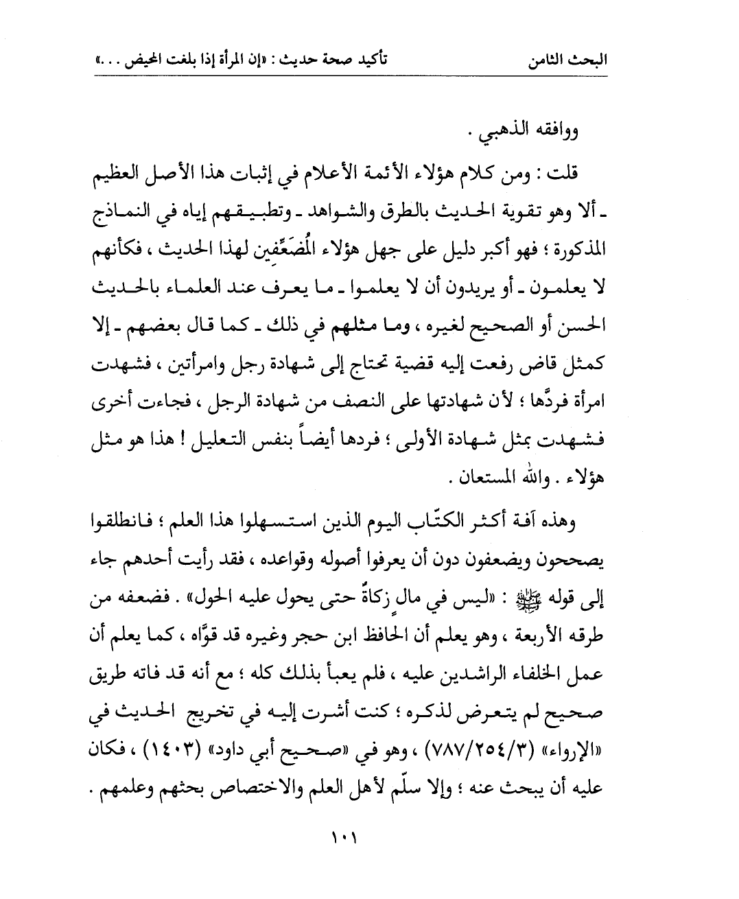 هذه آفة أكثر الكتاب اليوم الذين استسهلوا هذا العلم فانطلقوا يصححون ويضعفون دون أن يعرفوا أصوله وقواعده فقد رأيت أحدهم جاء إلى قوله A: " ليس في مال زكاة حتى يحول عليه الحول ". فضعفه من طرقه الأربعة وهو يعلم أن الحافظ ابن حجر وغيره قد قواه كما يعلم أن عمل الخلفاء الراشدين عليه فلم يعبأ بذلك كله مع أنه قد فاته طريق صحيح لم يتعرض لذكره كنت أشرت إليه في تخريج الحديث في " الإرواء " (3 / 254 / 767) وهو في " صحيح أبي داود " (1403) فكان عليه أن يبحث عنه وإلا سلم لأهل العلم والاختصاص بحثهم وعلمهم