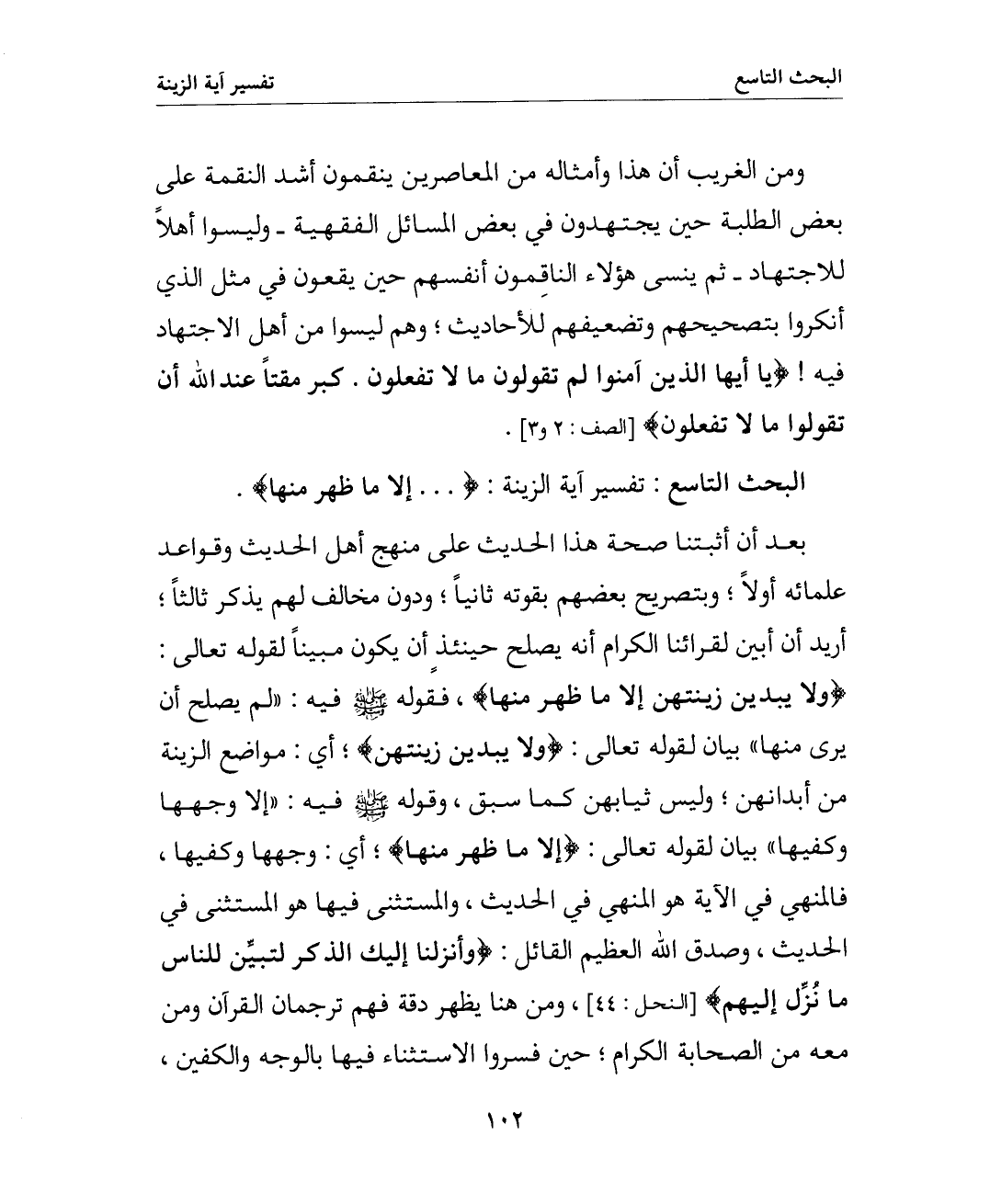 البحث التاسع: تفسير آية الزينة: (. . . إلا ما ظهر منها)