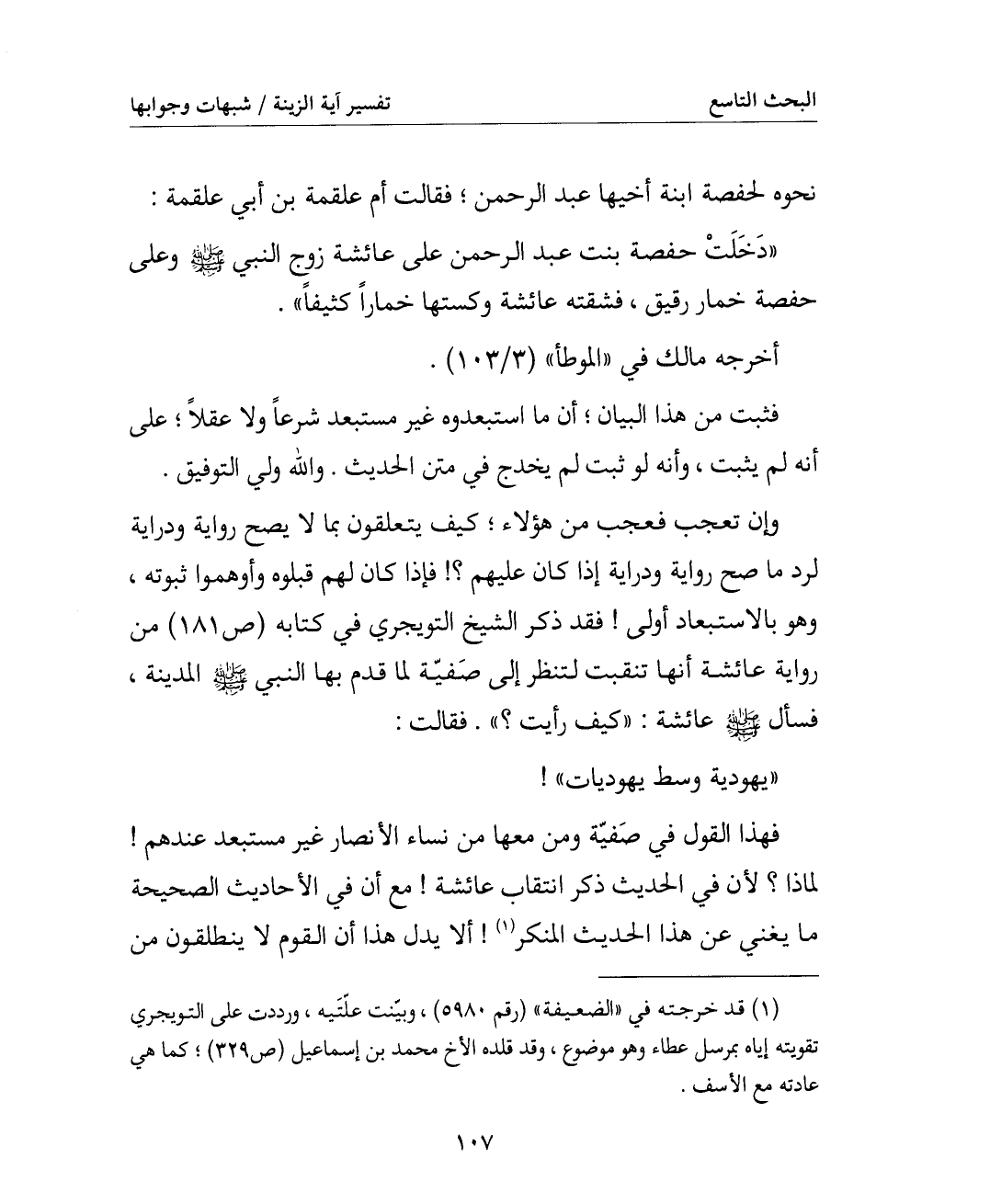 وإن تعجب فعجب من هؤلاء كيف يتعلقون بما لا يصح رواية ودراية إذا كان عليهم؟ فإذا كان لهم قبلوه وأوهموا ثبوته وهو بالاستبعاد أولى فقد ذكر الشيخ التويجري في كتابه (ص 181) من رواية عائشة أنها تنقبت لتنظر إلى صفية لما قدم بها النبي A المدينة فسأل A عائشة: