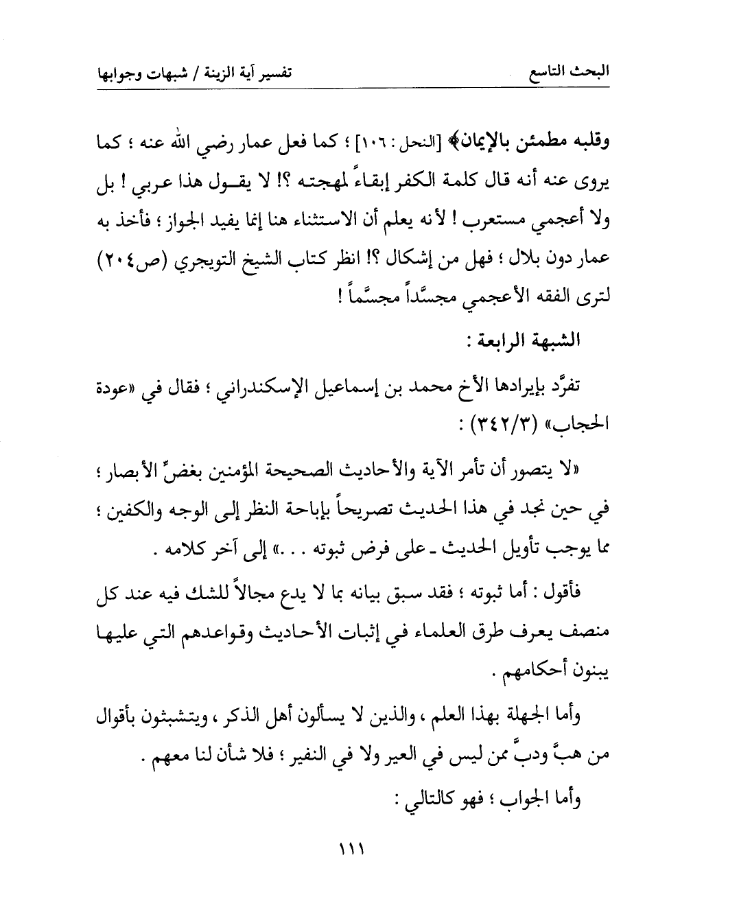 وقلبه مطمئن بالإيمان) [النحل: 106] كما فعل عمار Bهـ كما يروى عنه أنه قال كلمة الكفر إبقاء لمهجته؟ لا يقول هذا عربي بل ولا أعجمي مستعرب لأنه يعلم أن الاستثناء هنا إنما يفيد الجواز فأخذ به عمار دون بلال فهل من إشكال؟ انظر كتاب الشيخ التويجري (ص 204) لترى الفقه الأعجمي مجسدا مجسما