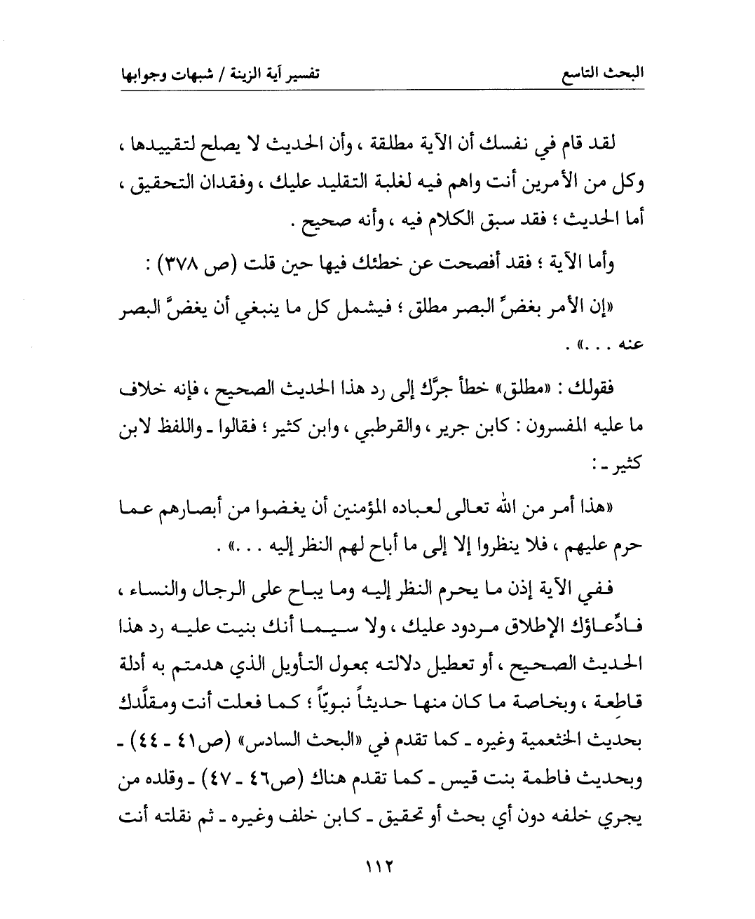 ففي الآية إذن ما يحرم النظر إليه وما يباح على الرجال والنساء فادعاؤك الإطلاق مردود عليك ولا سيما أنك بنيت عليه رد هذا الحديث الصحيح أو تعطيل دلالته بمعول التأويل الذي هدمتم به أدلة قاطعة وبخاصة ما كان منها حديثا نبويا كما فعلت أنت ومقلدك بحديث الخثعمية وغيره - كما تقدم في