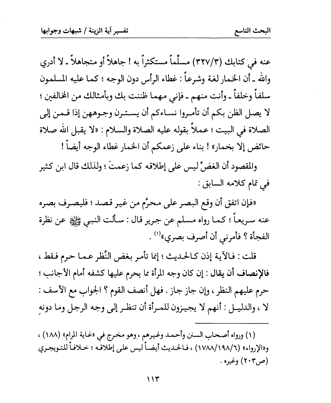 قلت: فالآية إذن كالحديث إنما تأمر بغض النظر عما حرم فقط فالإنصاف أن يقال: إن كان وجه المرأة مما يحرم عليها كشفه أمام الأجانب حرم عليهم النظر وإن جاز جاز. فهل أنصف القوم؟ الجواب مع الأسف: لا والدليل: أنهم لا يجيزون للمرأة أن تنظر إلى وجه الرجل وما دونه