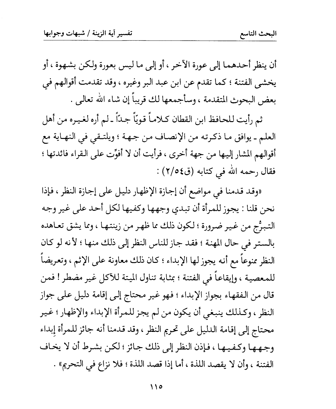 وقد قدمناه في مواضع أن إجازة الإظهار دليل على إجازة النظر فإذا نحن قلنا: يجوز للمرأة أن تبدي وجهها وكفيها لكل أحد على غير وجه التبرج من غير ضرورة لكون ذلك مما ظهر من زينتها ومما يشق تعاهده بالستر في حال المهنة فقد جاز للناس النظر إلى ذلك منها لأنه لو كان النظر ممنوعا مع أنه يجوز لها الإبداء كان ذلك معاونة على إثم وتعريضا للمعصية وإيقاعا في الفتنة بمثابة تناول الميتة للآكل غير المضطر فمن قال من الفقهاء بجواز الابداء فهو غير محتاج إلى إقامة دليل على جواز النظر وكذلك ينبغي أن يكون من لم يجز للمرأة الإبداء والإظهار غير محتاج إلى إقامة الدليل على تحريم النظر وقد قدمنا أنه جائز للمرأة إبداء وجهها وكفيها فإذن النظر إلى ذلك جائز لكن بشرط أن لا يخاف الفتنة وأن لا يقصد اللذة أما إذا قصد اللذة فلا نزاع في التحريم