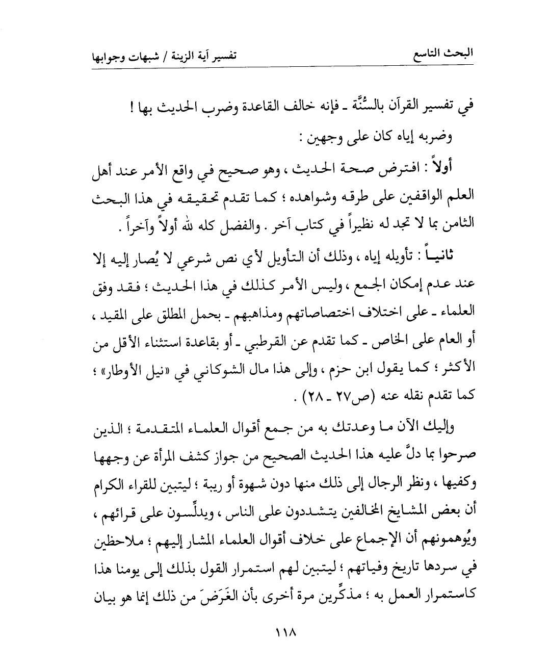 ما أمر الله بيانه من العلم ونهي عن كتمانه وبخاصة بعد أن قام أولئك المشايخ بكتمانه عن الناس وقلب الحقائق الشرعية حتى حمل ذلك آخرين من المتشددين على معاكستهم فألف أحدهم ما أسماه ب " تذكير الأصحاب بتحريم النقاب " فهذا في واد وأولئك في واد والحق بينهما كما كنت ذكرت نحوه في مقدمة الطبعة الثانية ل " الحجاب " فها هي الأسماء وبجانبها تاريخ الوفاة ومعها أقوالهم: