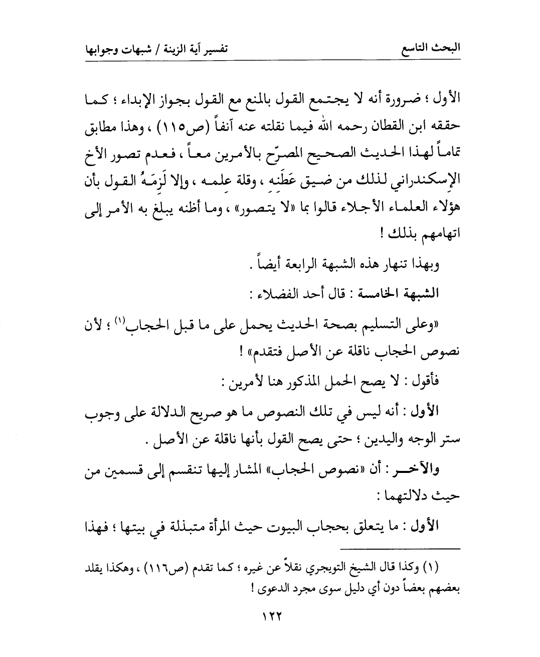 الأول ضرورة أنه لا يجتمع القول بالمنع مع القول بجواز الإبداء كما حققه ابن القطان C فيما نقلته عنه آنفا (ص 115) وهذا مطابق تماما لهذا الحديث الصحيح المصرح بالأمرين معا فعدم تصور الأخ الإسكندراني لذلك من ضيق عطنه وقلة علمه وإلا لزمه القول بأن هؤلاء العلماء الأجلاء قالوا بما " لا يتصور " وما أظنه يبلغ به الأمر إلى اتهامهم بذلك