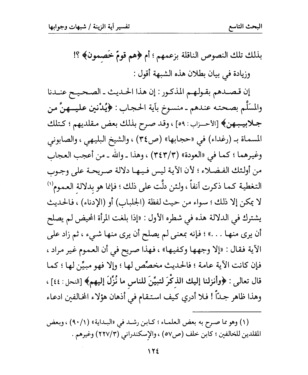 إن قصدهم بقولهم المذكور: إن هذا الحديث - الصحيح عندنا والمسلم بصحته عندهم - منسوخ بآية الحجاب: (يدنين عليهن من جلابيبهن) [الأحزاب: 59] وقد صرح بذلك بعض مقلديهم كتلك المسماة ب (رغداء) في " حجابها " (ص 34) والشيخ البليهي والصابوني وغيرهما كما في " العودة " (3 / 343) وهذا - والله - من أعجب العجاب من أولئك الفضلاء لأن الآية ليس فيها دلالة صريحة على وجوب التغطية كما ذكرت آنفا ولئن دلت على ذلك فإنما هو بدلالة العموم (1) لا يمكن إلا ذلك سواء من حيث لفظة (الجلباب) أو (الإدناء) فالحديث يشترك في الدلالة هذه في شطره الأول: " إذا بلغت المرأة المحيض لم يصلح أن يرى منها. . . " فإنه بمعنى لم يصلح أن يرى منها شيء ثم زاد على الآية فقال: " إلا وجهها وكفيها " فهذا صريح في أن العموم غير مراد فإن كانت الآية عامة فالحديث مخصص لها وإلا فهو مبين لها كما قال تعالى: (وأنزلنا إليك الذكر لتبين للناس ما نزل إليهم) [النحل: 44] وهذا ظاهر جدا فلا أدري كيف استقام في أذهان هؤلاء المخالفين ادعاء