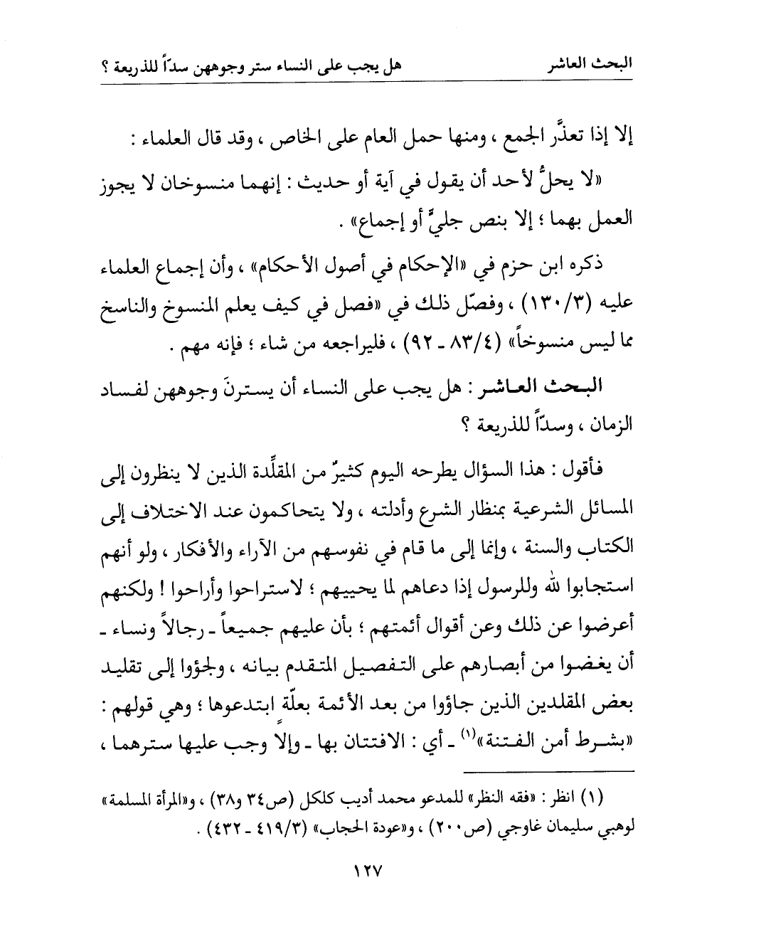 البحث العاشر: هل يجب على النساء أن يسترن وجوههن لفساد الزمان وسدا للذريعة؟