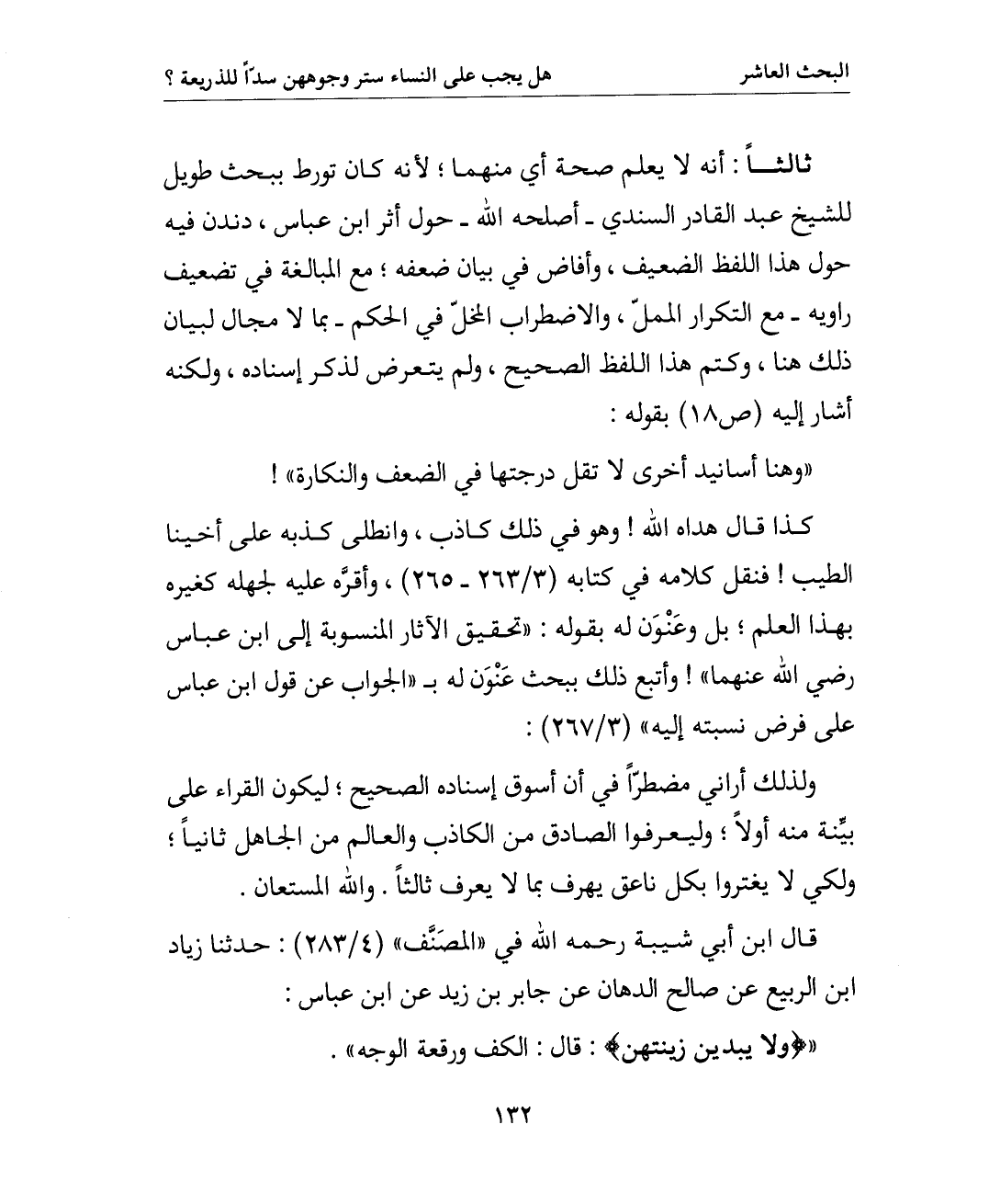 ثالثا: أنه لا يعلم صحة أي منهما لأنه كان تورط ببحث طويل للشيخ عبد القادر السندي - أصلحه الله - حول أثر ابن عباس دندن فيه حول هذا اللفظ الضعيف وأفاض في بيان ضعفه مع المبالغة في تضعيف رواية - مع التكرار الممل والاضطراب المخل في الحكم - بما لا مجال لبيان ذلك هنا وكتم هذا اللفظ الصحيح ولم يتعرض لذكر إسناده ولكنه أشار إليه (ص 18) بقوله: