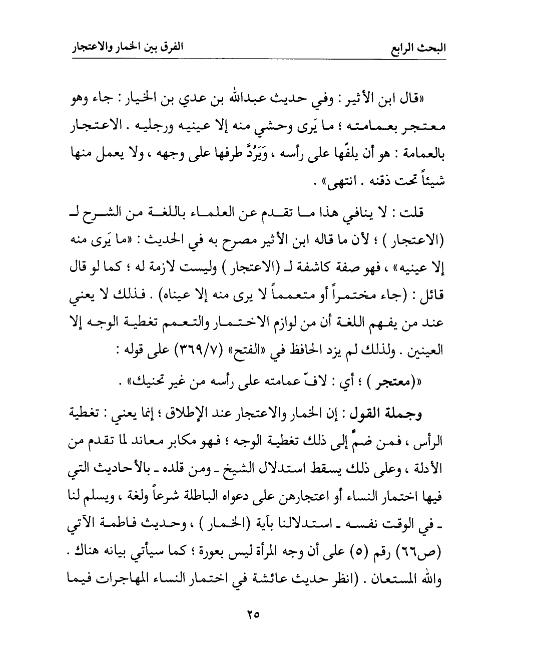 قلت: لا ينافي هذا ما تقدم عن العلماء باللغة من الشرح ل (الاعتجار) لأن ما قاله ابن الأثير مصرح به في الحديث: " ما يرى منه إلا عينيه " فهو صفة كاشفة ل (الاعتجار) وليست لازمة له كما لو قال قائل: (جاء مختمرا أو متعمما لا يرى منه إلا عيناه) . فذلك لا يعني عند من يفهم اللغة أن من لوازم الاختمار والتعمم تغطية الوجه إلا العينين. ولذلك لم يزد الحافظ في " الفتح (7 / 369) على قوله: