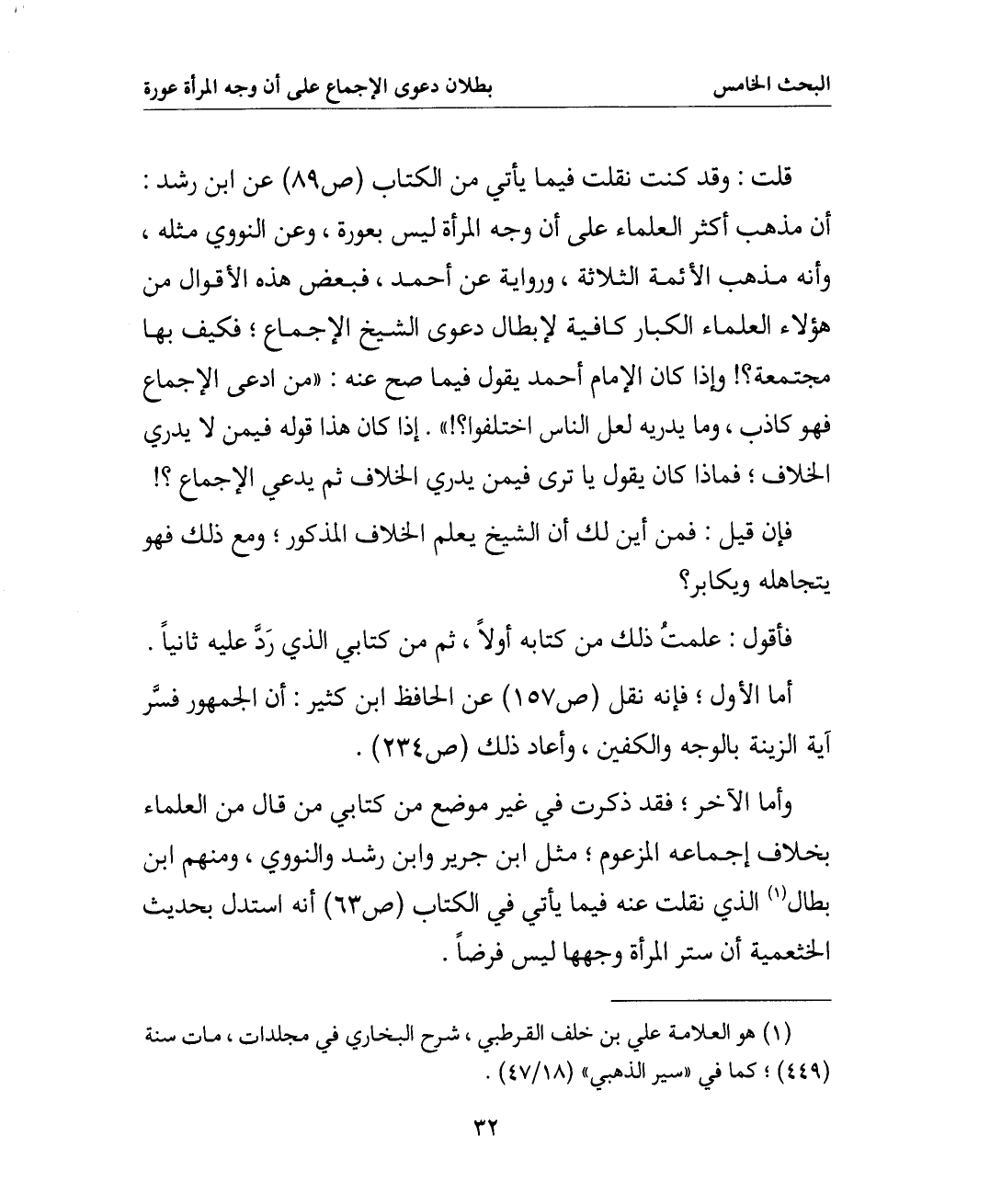 وأما الآخر فقد ذكرت في غير موضع من كتابي من قال من العلماء بخلاف إجماعه المزعوم مثل ابن جرير وابن رشد والنووي ومنهم ابن بطال (1) الذي نقلت عنه فيما يأتي في الكتاب (ص 63) أنه استدل بحديث الخثعمية أن ستر المرأة وجهها ليس فرضا