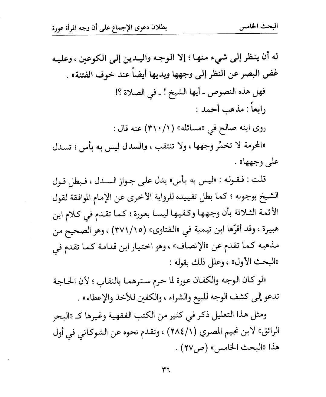 قلت: فقوله: " ليس به بأس " يدل على جواز السدل فبطل قول الشيخ بوجوبه كم بطل تقييده للرواية الأخرى عن الإمام الموافقة لقول الأئمة الثلاثة بأن وجهها وكفيها ليسا بعورة كما تقدم في كلام ابن هبيرة وقد أقرها ابن تيمية في " الفتاوى " (15 / 371) وهو الصحيح من مذهبه كما تقدم عن " الإنصاف " وهو اختيار ابن قدامة كما تقدم في " البحث الأول " وعلل ذلك بقوله: