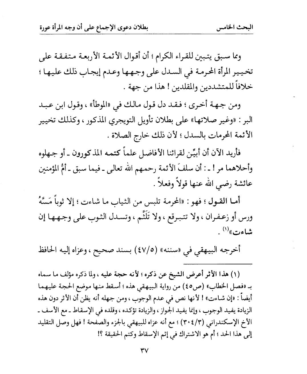 ومن جهة أخرى فقد دل قول مالك في " الموطأ " وقول ابن عبد البر: " وغير صلاتها " على بطلان تأويل التويجري المذكور وكذلك تخيير الأئمة المحرمات بالسدل لأن ذلك خارج الصلاة