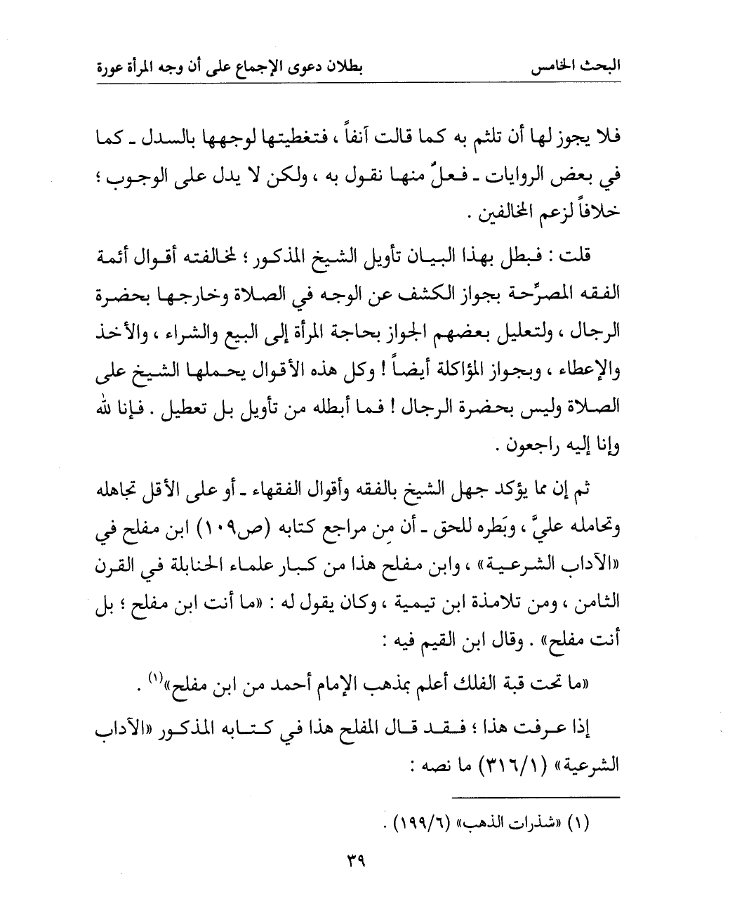 ثم إن مما يؤكد جهل الشيخ بالفقه وأقوال الفقهاء - أو على الأقل تجاهله وتحامله علي وبطره للحق - أن من مراجع كتابه (ص 109) ابن مفلح في " الآداب الشرعية " وابن مفلح هذا من كبار علماء الحنابلة في القرن الثامن ومن تلامذة ابن تيمية وكان يقول له: " ما أنت ابن مفلح بل أنت مفلح ". وقال ابن القيم فيه: