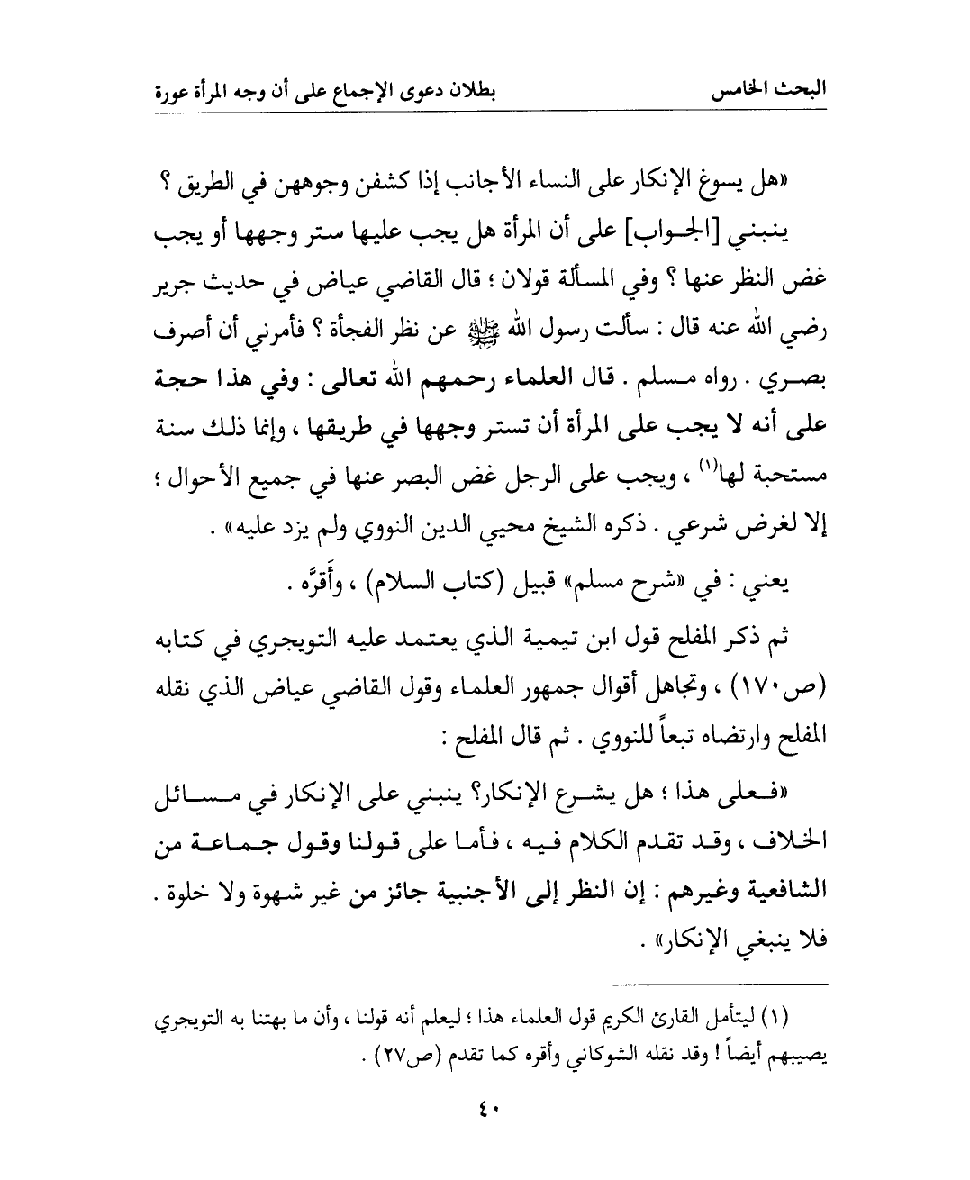 ثم ذكر المفلح قول ابن تيمية الذي يعتمد عليه التويجري في كتابه (ص 170) وتجاهل أقوال جمهور العلماء وقول القاضي عياض الذي نقله المفلح وارتضاه تبعا للنووي. ثم قال المفلح: