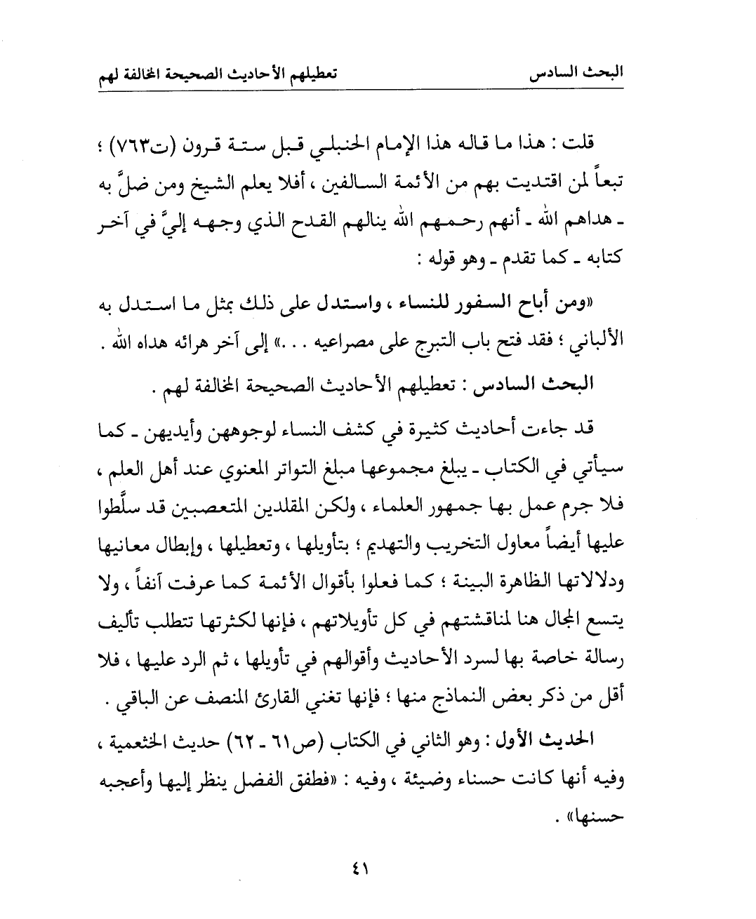 قلت: هذا ما قاله هذا الإمام الحنبلي قبل ستة قرون (ت 763) تبعا لمن اقتديت بهم من الأئمة السالفين أفلا يعلم الشيخ ومن ضل به - هداهم الله - أنهم رحمهم الله ينالهم القدح الذي وجهه إلي في آخر كتابه - كما تقدم - وهو قوله: