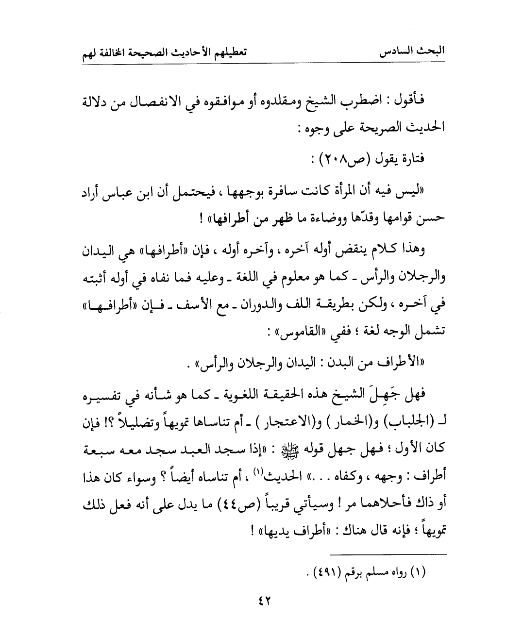 (صحيح) " إذا سجد العبد سجد معه سبعة أطراف: وجهه وكفاه. . . " الحديث (1) أم تناساه أيضا؟ وسواه كان هذا أو ذاك فأحلاهما مر وسيأتي قريبا (ص 44) ما يدل على أنه فعل ذلك تمويها فإنه هناك: " أطراف يديها "